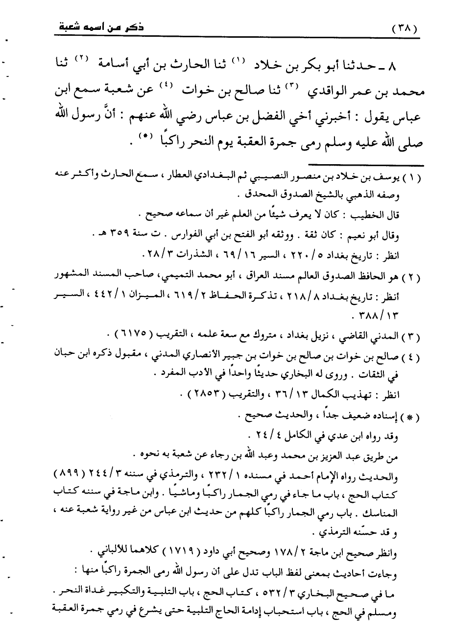 8 - حَدَّثَنَا أَبُو بَكْرِ بْنُ خَلَّادٍ، ثنا الْحَارِثُ بْنُ أَبِي أُسَامَةَ، ثنا مُحَمَّدُ بْنُ عُمَرَ الْوَاقِدِيُّ، ثنا صَالِحُ بْنُ خَوَّاتٍ، عَنْ شُعْبَةَ، سَمِعَ ابْنَ عَبَّاسٍ، يَقُولُ: أَخْبَرَنِي أَخِي الْفَضْلُ بْنُ عَبَّاسٍ، رَضِيَ اللَّهُ عَنْهُمْ «أَنَّ رَسُولَ اللَّهِ صَلَّى اللهُ عَلَيْهِ وَسَلَّمَ §رَمَى جَمْرَةَ الْعَقَبَةِ يَوْمَ النَّحْرِ رَاكِبًا»