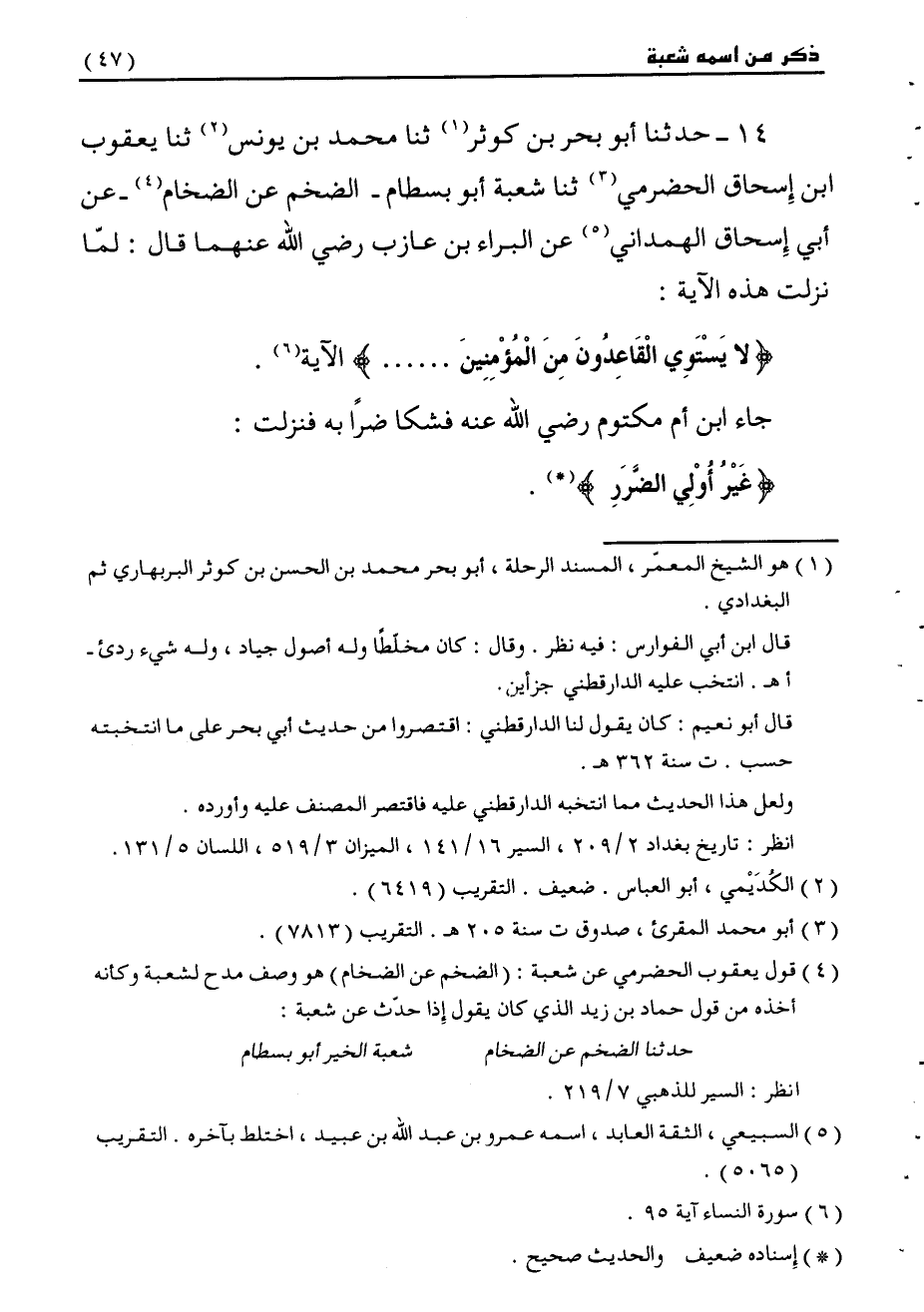 14 - حَدَّثَنَا أَبُو بَحْرِ بْنُ كَوْثَرٍ، ثنا مُحَمَّدُ بْنُ يُونُسَ، ثنا يَعْقُوبُ بْنُ إِسْحَاقَ الْحَضْرَمِيُّ، ثنا شُعْبَةُ أَبُو بِسْطَامٍ، الضَّخْمُ عَنِ الضِّخَامِ، عَنْ أَبِي إِسْحَاقَ الْهَمْدَانِيِّ، عَنِ الْبَرَاءِ بْنِ عَازِبٍ، رَضِيَ اللَّهُ عَنْهُمَا قَالَ: " لَمَّا نَزَلَتْ هَذِهِ الْآيَةُ: {§لَا يَسْتَوِي} [النساء: 95] الْقَاعِدُونَ مِنَ الْمُؤْمِنِينَ الْآيَةَ , جَاءَ ابْنُ أُمِّ مَكْتُومٍ رَضِيَ اللَّهُ عَنْهُ فَشَكَا ضُرًّا بِهِ , فَنَزَلَتْ: {غَيْرُ أُولِي الضَّرَرِ} [النساء: 95] "
