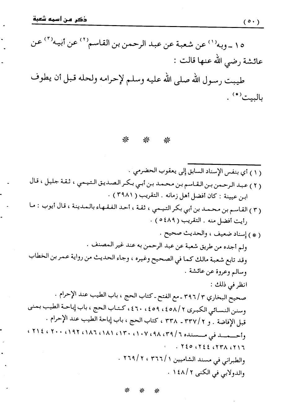 15 - وَبِهِ عَنْ شُعْبَةَ، عَنْ عَبْدِ الرَّحْمَنِ بْنِ الْقَاسِمِ، عَنْ أَبِيهِ، عَنْ عَائِشَةَ، رَضِيَ اللَّهُ عَنْهَا قَالَتْ: §«طَيَّبْتُ رَسُولَ اللَّهِ صَلَّى اللهُ عَلَيْهِ وَسَلَّمَ لِإِحْرَامِهِ وَلِحِلِّهِ قَبْلَ أَنْ يَطُوفَ بِالْبَيْتِ»