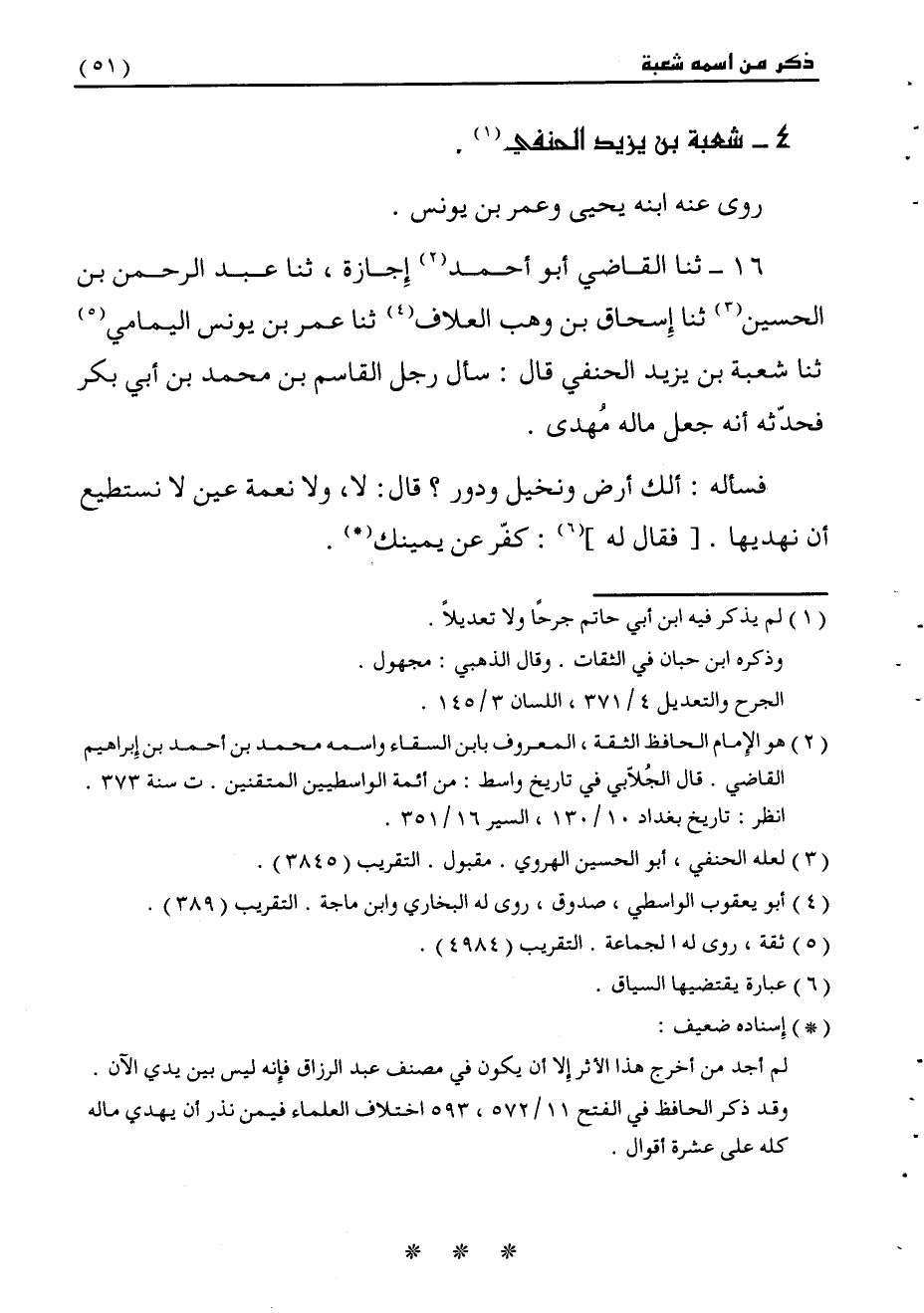 ثنا الْقَاضِي أَبُو أَحْمَدَ إِجَازَةً , ثنا عَبْدُ الرَّحْمَنِ بْنُ الْحُسَيْنِ، ثنا إِسْحَاقُ بْنُ وَهْبٍ الْعَلَّافُ، ثنا عُمَرُ بْنُ يُونُسَ الْيَمَامِيُّ، ثنا شُعْبَةُ بْنُ يَزِيدَ الْحَنَفِيُّ، قَالَ: سَأَلَ رَجُلٌ الْقَاسِمَ بْنَ مُحَمَّدِ بْنِ أَبِي بَكْرٍ فَحَدَّثَهُ أَنَّهُ، جَعَلَ مَالَهُ مُهْدًى فَسَأَلَهُ «أَلَكَ أَرْضٌ وَنَخِيلٌ وَدُورٌ؟» قَالَ: لَا , وَلَا نِعْمَةُ عَيْنٍ لَا نَسْتَطِيعُ أَنْ نُهْدِيَهَا , فَقَالَ لَهُ: §«كَفِّرْ عَنْ يَمِينِكَ»