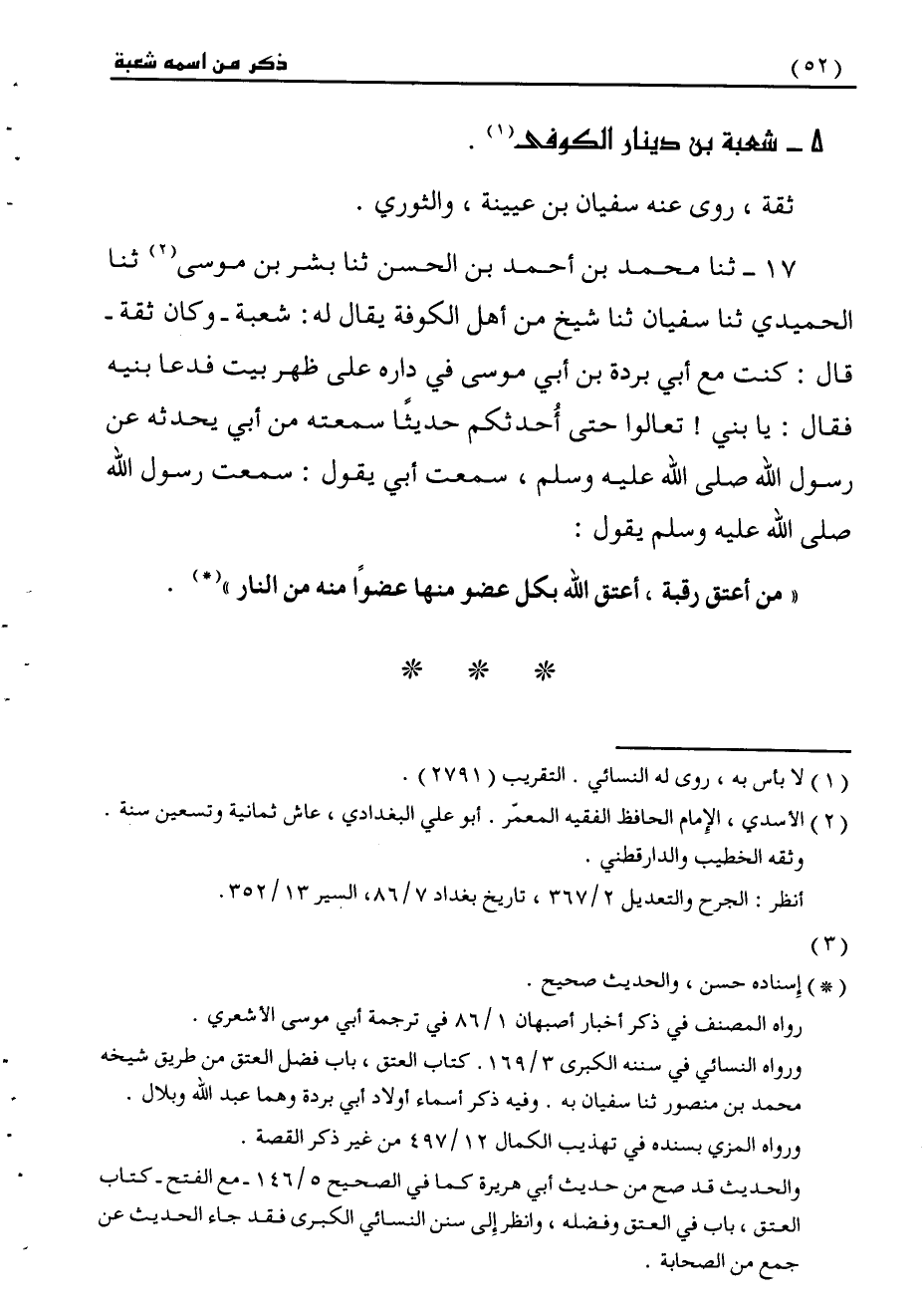 ثنا مُحَمَّدُ بْنُ أَحْمَدَ بْنِ الْحَسَنِ، ثنا بِشْرُ بْنُ مُوسَى، ثنا الْحُمَيْدِيُّ، ثنا سُفْيَانُ، ثنا شَيْخٌ، مِنْ أَهْلِ الْكُوفَةِ يُقَالُ لَهُ شُعْبَةُ وَكَانَ ثِقَةً قَالَ: كُنْتُ مَعَ أَبِي بُرْدَةَ بْنِ أَبِي مُوسَى فِي دَارِهِ عَلَى ظَهْرِ بَيْتٍ، فَدَعَا بَنِيهِ، فَقَالَ: يَا بَنِيَّ، تَعَالَوْا حَتَّى أُحَدِّثَكُمْ حَدِيثًا سَمِعْتُهُ مِنْ أَبِي يُحَدِّثُهُ عَنْ رَسُولِ اللَّهِ صَلَّى اللهُ عَلَيْهِ وَسَلَّمَ , سَمِعْتُ أَبِي يَقُولُ: سَمِعْتُ رَسُولَ اللَّهِ صَلَّى اللهُ عَلَيْهِ وَسَلَّمَ يَقُولُ: §«مَنْ أَعْتَقَ رَقَبَةً أَعْتَقَ اللَّهُ بِكُلِّ عُضْوٍ مِنْهَا عُضْوًا مِنْهُ مِنَ النَّارِ»