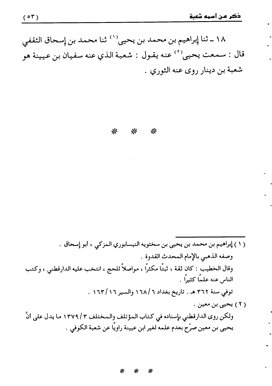 18 - ثنا إِبْرَاهِيمُ بْنُ مُحَمَّدِ بْنِ يَحْيَى، ثنا مُحَمَّدُ بْنُ إِسْحَاقَ الثَّقَفِيُّ، قَالَ: سَمِعْتُ يَحْيَى، عَنْهُ يَقُولُ: §«شُعْبَةُ الَّذِي يَرْوِي عَنْهُ سُفْيَانُ بْنُ عُيَيْنَةَ هُوَ شُعْبَةُ بْنُ دِينَارٍ , رَوَى عَنْهُ الثَّوْرِيُّ»