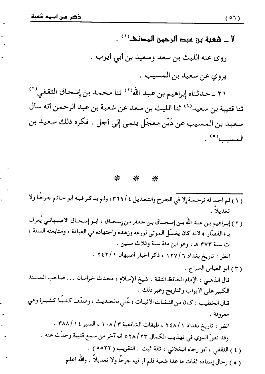 حَدَّثَنَاهُ إِبْرَاهِيمُ بْنُ عَبْدِ اللَّهِ، ثنا مُحَمَّدُ بْنُ إِسْحَاقَ الثَّقَفِيُّ، ثنا قُتَيْبَةُ بْنُ سَعِيدٍ، ثنا اللَّيْثُ بْنُ سَعْدٍ، عَنْ شُعْبَةَ بْنِ عَبْدِ الرَّحْمَنِ، أَنَّهُ «سَأَلَ سَعِيدَ بْنَ الْمُسَيَّبِ عَنْ §دَيْنٍ مُعَجَّلٍ يُنْمَى إِلَى أَجَلٍ فَكَرِهَ ذَلِكَ سَعِيدُ بْنُ الْمُسَيَّبِ»