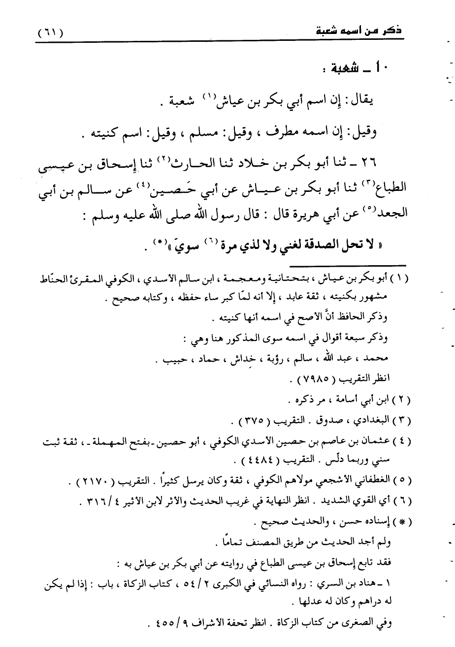 §شُعْبَةُ يُقَالُ: إِنَّ اسْمَ أَبِي بَكْرِ بْنِ عَيَّاشٍ شُعْبَةُ وَقِيلَ إِنَّ اسْمَهُ مُطَرِّفٌ , وَقِيلَ: مُسْلِمٌ , وَقِيلَ: اسْمُ كُنْيَتِهِ