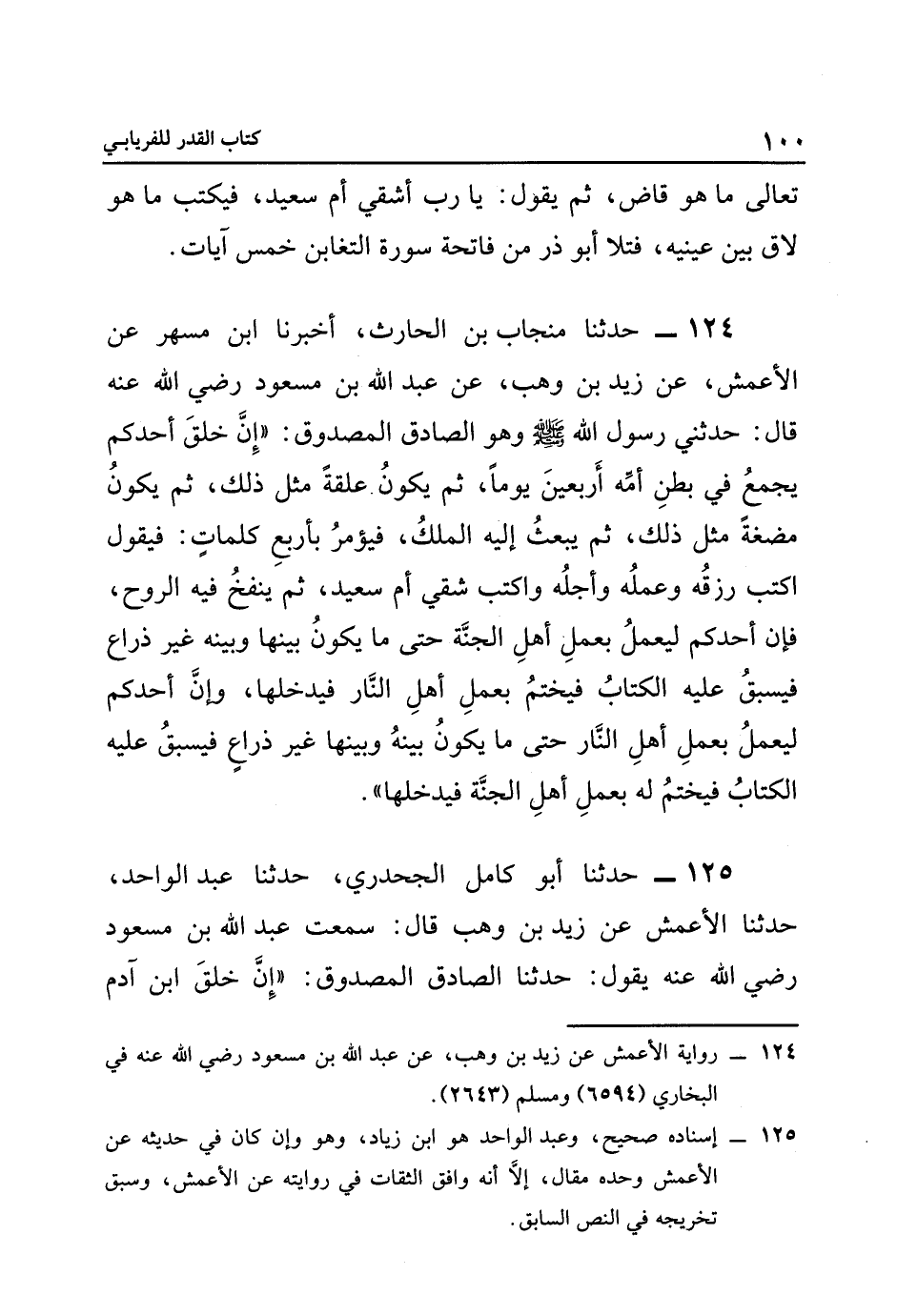 ١٢٤ حَدَّثَنَا مِنْجَابُ بْنُ الْحَارِثِ، أَخْبَرَنَا ابْنُ مُسْهِرٍ، عَنِ الْأَعْمَشِ، عَنْ زَيْدِ بْنِ وَهْبٍ، عَنْ عَبْدِ اللَّهِ بْنِ مَسْعُودٍ رَضِيَ اللَّهُ عَنْهُ، قَالَ: حَدَّثَنِي رَسُولُ اللَّهِ صَلَّى اللهُ عَلَيْهِ وَسَلَّمَ، وَهُوَ الصَّادِقُ الْمَصْدُوقُ: "إِنَّ خَلْقَ أَحَدِكُمْ يُجْمَعُ فِي بَطْنِ أُمِّهِ أَرْبَعِينَ يَوْمًا، ثُمَّ يَكُونُ عَلَقَةً مِثْلَ ذَلِكَ، ثُمَّ يَكُونُ مُضْغَةً مِثْلَ ذَلِكَ، ثُمَّ يُبْعَثُ إِلَيْهِ الْمَلَكُ، فَيُؤْمَرُ بِأَرْبَعِ كَلَمَّاتٍ: فَيَقُولُ اكْتُبْ رِزْقَهُ وَعَمَلَهُ وَأَجَلَهُ، وَاكْتُبْ شَقِيُّ أَمْ سَعِيدٌ، ثُمَّ يُنْفَخُ فِيهِ الرُّوحُ، فَإِنَّ أَحَدَكُمْ لَيَعْمَلُ بِعَمَلِ أَهْلِ الْجَنَّةِ حَتَّى مَا يَكُونُ بَيْنَهَا وَبَيْنَهُ غَيْرَ ذِرَاعٍ، فَيَسْبِقُ عَلَيْهِ الْكِتَابُ فَيُخْتَمُ بِعَمَلِ أَهْلِ النَّارِ فَيَدْخُلُهَا، وَإِنَّ أَحَدَكُمْ لَيَعْمَلُ بِعَمَلِ أَهْلِ النَّارِ حَتَّى مَا يَكُونُ بَيْنَهُ وَبَيْنَهَا غَيْرُ ذِرَاعٍ، فَيَسْبِقُ عَلَيْهِ الْكِتَابُ فَيُخْتَمُ لَهُ بِعَمَلِ أَهْلِ الْجَنَّةِ فَيَدْخُلُهَا".