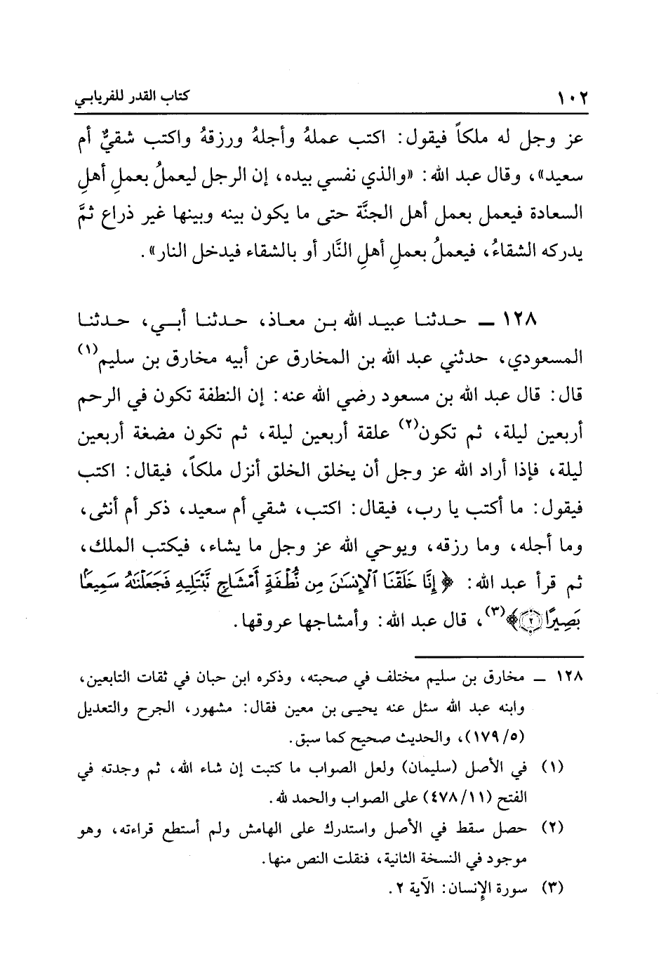 ١٢٨ حَدَّثَنَا عُبَيْدُ اللَّهِ بْنُ مُعَاذٍ، حَدَّثَنَا أَبِي، حَدَّثَنَا الْمَسْعُودِيُّ، حَدَّثَنِي عَبْدُ اللَّهِ بْنُ الْمُخَارِقِ، عَنْ أَبِيهِ مُخَارِقِ بْنِ سُلَيْمٍ١، قَالَ: قَالَ عَبْدُ اللَّهِ بْنُ مَسْعُودٍ رَضِيَ اللَّهُ عَنْهُ: إِنَّ النُّطْفَةَ تَكُونُ فِي الرَّحِمِ أَرْبَعِينَ لَيْلَةً، ثُمَّ تَكُونُ٢ عَلَقَةً أَرْبَعِينَ لَيْلَةً، ثُمَّ تَكُونُ مُضْغَةً أَرْبَعِينَ لَيْلَةً، فَإِذَا أَرَادَ اللَّهُ عَزَّ وَجَلَّ أَنْ يَخْلُقَ الْخَلْقَ أَنْزَلَ مَلَكًا، فَيُقَالُ: اكْتُبْ، فَيَقُولُ: مَا أَكْتُبُ يَا رَبِّ؟، فَيُقَالُ: اكْتُبْ، شَقِيُّ أَمْ سَعِيدٌ، ذَكَرٌ أَمْ أُنْثَى، وَمَا أَجَلُهُ، وَمَا رِزْقُهُ، وَيُوحِي اللَّهُ عَزَّ وَجَلَّ مَا يَشَاءُ، فَيَكْتُبُ الْمَلَكُ، ثُمَّ قَرَأَ عَبْدُ اللَّهِ: {إِنَّا خَلَقْنَا الإِنسَانَ مِنْ نُطْفَةٍ أَمْشَاجٍ نَبْتَلِيهِ فَجَعَلْنَاهُ سَمِيعاً بَصِيراً} ٣، قال عبد الله: وأمشاجها عروقها.