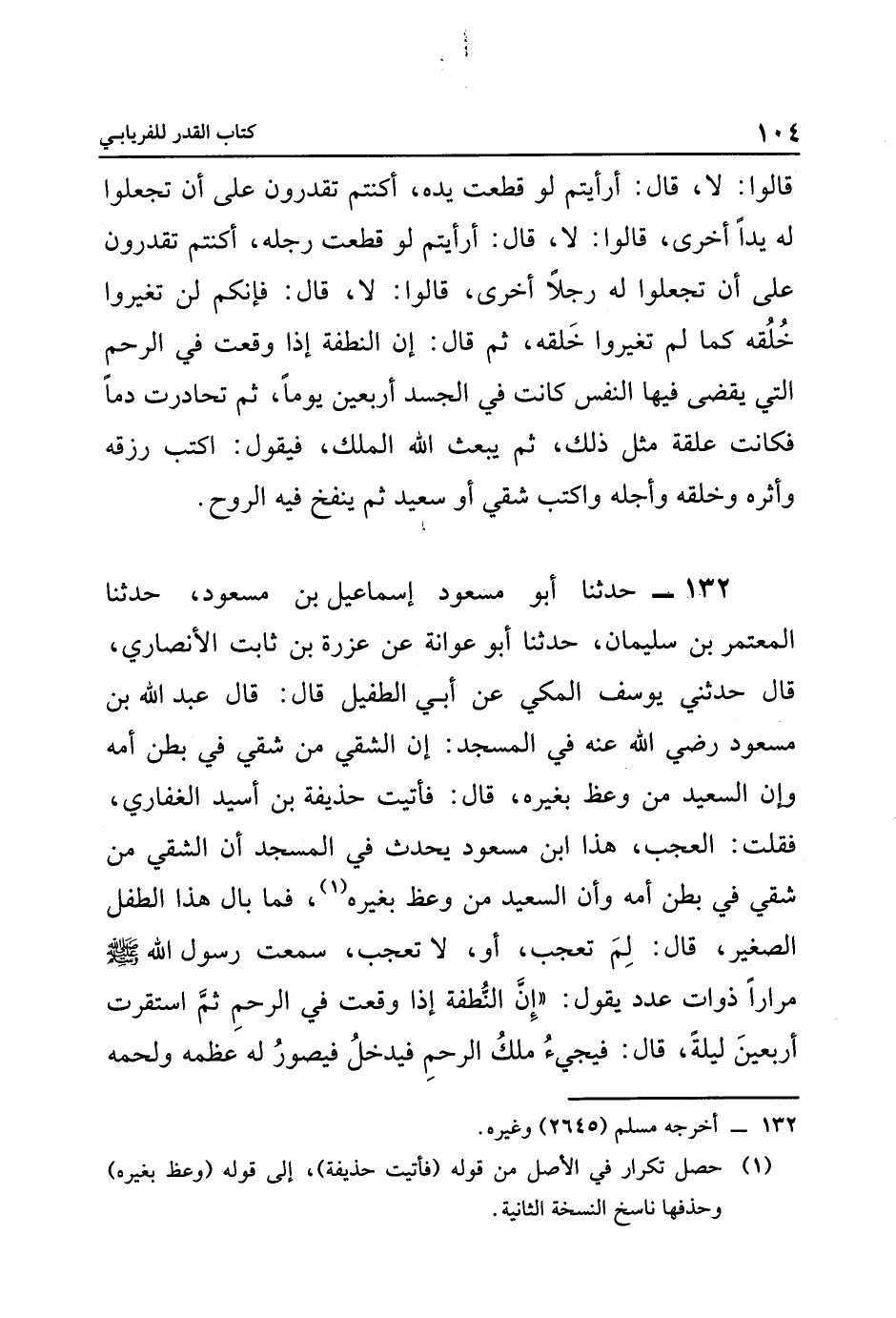 ١٣٢ حَدَّثَنَا أَبُو مَسْعُودٍ إِسْمَاعِيلُ بْنُ مَسْعُودٍ، حَدَّثَنَا الْمُعْتَمِرُ بْنُ سُلَيْمَانَ، حَدَّثَنَا أَبُو عَوَانَةَ, عَنْ عَزْرَةَ بْنِ ثَابِتٍ الْأَنْصَارِيِّ، قَالَ: حَدَّثَنِي يُوسُفُ الْمَكِّيُّ عَنْ أَبِي الطُّفَيْلِ, قَالَ: قَالَ عَبْدُ اللَّهِ بْنُ مَسْعُودٍ رَضِيَ اللَّهُ عَنْهُ فِي الْمَسْجِدِ: إن الشقي من شقي في بطن أمه, وَإِنَّ السَّعِيدَ مَنْ وُعِظَ بِغَيْرِهِ، قَالَ: فَأَتَيْتُ حُذَيْفَةَ بْنَ أَسِيدٍ الْغِفَارِيَّ، فَقُلْتُ: الْعَجَبُ، هَذَا ابْنُ مَسْعُودٍ يحدِّث فِي الْمَسْجِدِ: أَنَّ الشَّقِيَّ من شقي في بطن أمه, وأن السعيد مَنْ وُعِظَ بِغَيْرِهِ١، فَمَا بَالُ هَذَا الطِّفْلِ الصَّغِيرِ؟، قَالَ: لِمَ تَعْجَبُ؟، أَوْ: لَا تَعْجَبْ، سمعت رسول الله صلى الله عليه وسلم مِرَارًا ذَوَاتِ عَدَدٍ, يَقُولُ: "إِنَّ النُّطْفَةَ إِذَا وَقَعَتْ فِي الرَّحِمِ, ثُمَّ اسْتَقَرَّتْ أَرْبَعِينَ لَيْلَةً، قَالَ: فَيَجِيءُ مَلَكُ الرَّحِمِ, فَيَدْخُلُ, فَيُصَوِّرُ لَهُ عظمه, ولحمه.