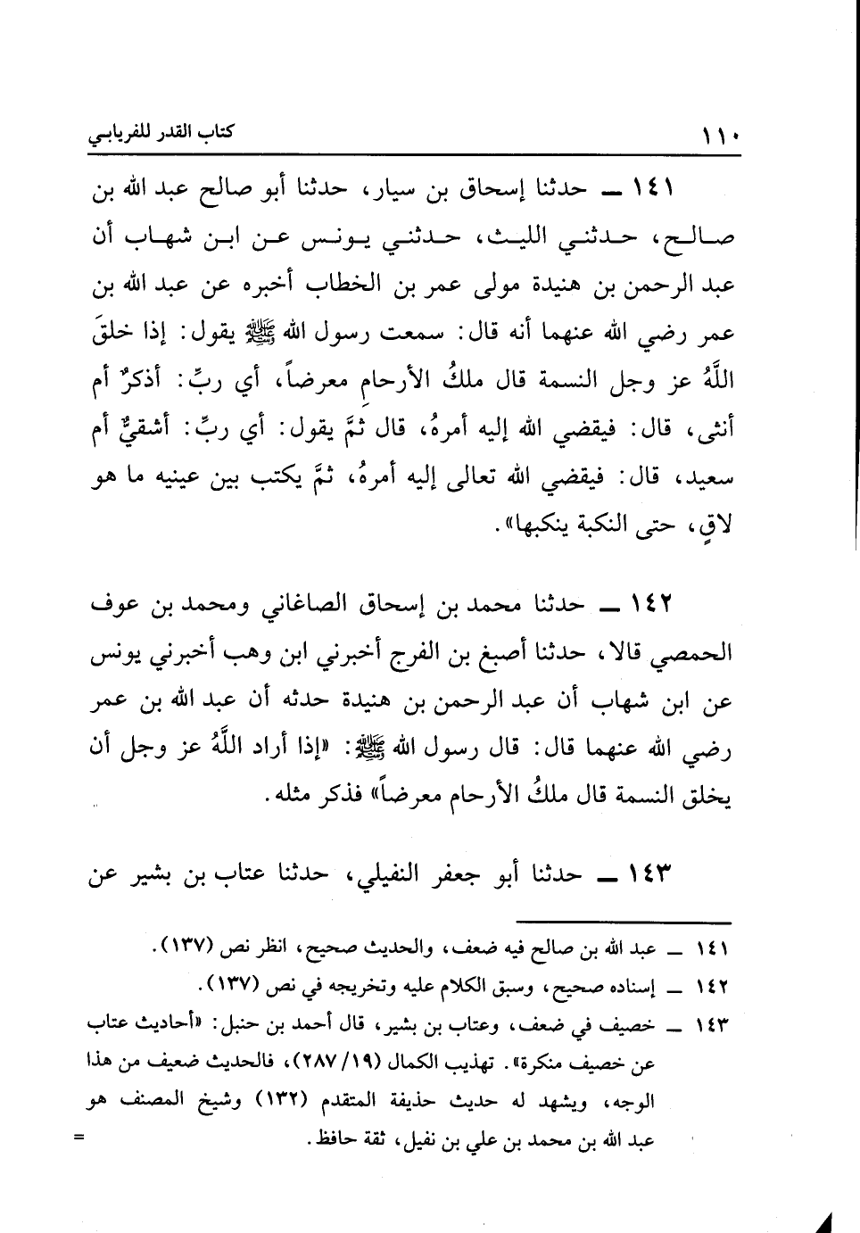 ١٤١ حَدَّثَنَا إِسْحَاقُ بْنُ سَيَّارٍ، حَدَّثَنَا أَبُو صَالِحٍ عَبْدُ اللَّهِ بْنُ صَالِحٍ، حَدَّثَنِي اللَّيْثُ، حَدَّثَنِي يُونُسُ, عَنِ ابْنِ شِهَابٍ, أَنَّ عَبْدَ الرَّحْمَنِ بْنَ هُنَيْدَةَ مَوْلَى عُمَرَ بْنِ الْخَطَّابِ أَخْبَرَهُ عَنْ عَبْدِ اللَّهِ بْنِ عُمَرَ رَضِيَ اللَّهُ عَنْهُمَا, أَنَّهُ قَالَ: سَمِعْتُ رَسُولَ اللَّهِ صَلَّى اللهُ عَلَيْهِ وَسَلَّمَ, يَقُولُ: "إِذَا خَلَقَ اللَّهُ عَزَّ وَجَلَّ النَّسَمَةَ, قَالَ مَلَكُ الْأَرْحَامِ مُعْرِضًا: أَيْ رَبِّ, أَذَكَرٌ أَمْ أُنْثَى؟، قَالَ: فَيَقْضِي اللَّهُ إِلَيْهِ أَمْرَهُ، قَالَ ثُمَّ يَقُولُ: أَيْ رَبِّ, أَشَقِيُّ أَمْ سَعِيدٌ؟، قَالَ: فَيَقْضِي اللَّهُ تَعَالَى إِلَيْهِ أَمْرَهُ، ثُمَّ يَكْتُبُ بَيْنَ عَيْنَيْهِ مَا هُوَ لاقٍ، حَتَّى النَّكْبَةَ يُنْكَبُهَا".