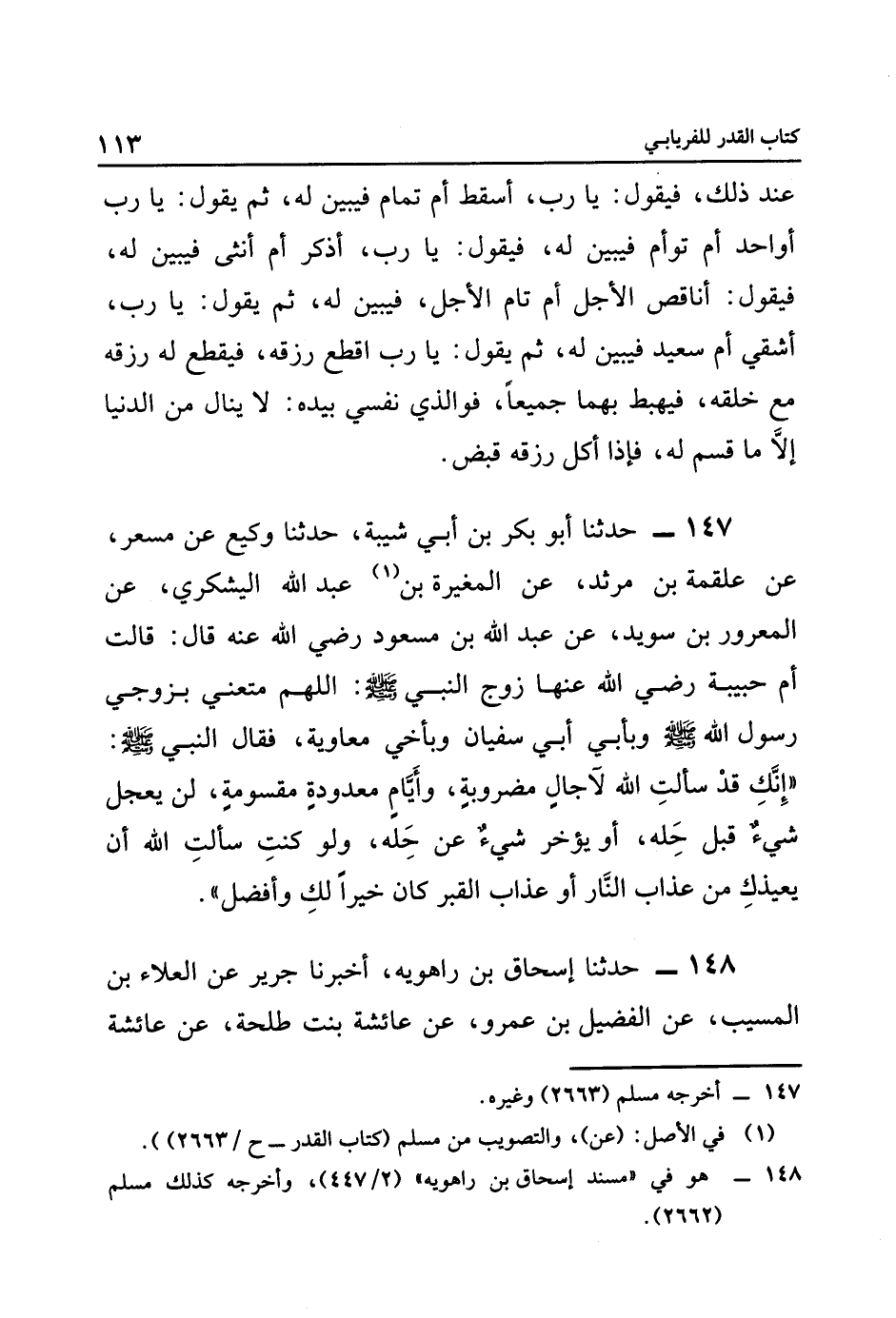 ١٤٧ حَدَّثَنَا أَبُو بَكْرِ بْنُ أَبِي شَيْبَةَ، حَدَّثَنَا وَكِيعٌ, عَنْ مِسْعَرٍ، عَنْ عَلْقَمَةَ بْنِ مَرْثَدٍ، عَنِ الْمُغِيرَةِ بْنِ١ عَبْدِ اللَّهِ الْيَشْكُرِيِّ، عَنِ الْمَعْرُورِ بْنِ سُوَيْدٍ، عَنْ عبد الله بن مسعود رضي الله عنه, قَالَ: قَالَتْ أُمُّ حَبِيبَةَ رَضِيَ اللَّهُ عَنْهَا زَوْجُ النَّبِيِّ صَلَّى اللهُ عَلَيْهِ وَسَلَّمَ: اللَّهُمَّ مَتِّعْنِي بِزَوْجِي رَسُولِ اللَّهِ صَلَّى اللهُ عَلَيْهِ وَسَلَّمَ, وَبَأَبِي أَبِي سُفْيَانَ, وَبِأَخِي مُعَاوِيَةَ، فَقَالَ النَّبِيُّ صَلَّى اللهُ عَلَيْهِ وَسَلَّمَ: "إِنَّكِ قَدْ سَأَلْتِ اللَّهَ لِآجَالٍ مَضْرُوبَةٍ، وَأَيَّامٍ مَعْدُودَةٍ مَقْسُومَةٍ، لَنْ يُعَجَّلَ شَيْءٌ قَبْلَ حِلِّهِ، أَوْ يُؤَخَّرَ شَيْءٌ عَنْ حِلِّهِ، وَلَوْ كُنْتِ سَأَلْتِ اللَّهَ أَنْ يُعِيذَكِ مِنْ عَذَابِ النَّارِ, أَوْ عَذَابِ الْقَبْرِ كَانَ خَيْرًا لَكِ وَأَفْضَلَ".