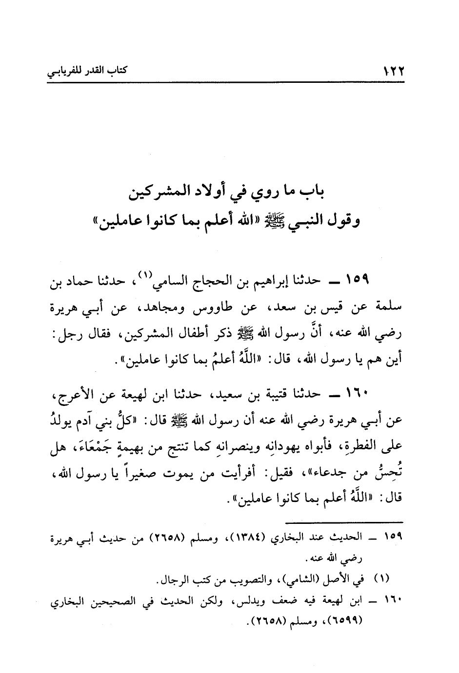 ١٦٠ حَدَّثَنَا قُتَيْبَةُ بْنُ سَعِيدٍ، حَدَّثَنَا ابْنُ لَهِيعَةَ, عَنِ الْأَعْرَجِ، عَنْ أَبِي هُرَيْرَةَ رَضِيَ اللَّهُ عَنْهُ أَنَّ رَسُولَ اللَّهِ صَلَّى اللهُ عَلَيْهِ وَسَلَّمَ قَالَ: "كُلُّ بَنِي آدَمَ يُولَدُ عَلَى الْفِطْرَةِ، فَأَبَوَاهُ يُهَوِّدَانِهِ, وَيُنَصِّرَانِهِ, كَمَا تُنْتَجُ مِنْ بَهِيمَةٍ جَمْعَاءَ، هَلْ تُحِسُّ مِنْ جَدْعَاءَ"، فَقِيلَ: أَفَرَأَيْتَ مَنْ يَمُوتُ صَغِيرًا يَا رَسُولَ اللَّهِ؟، قَالَ: "اللَّهُ أَعْلَمُ بِمَا كَانُوا عاملين".