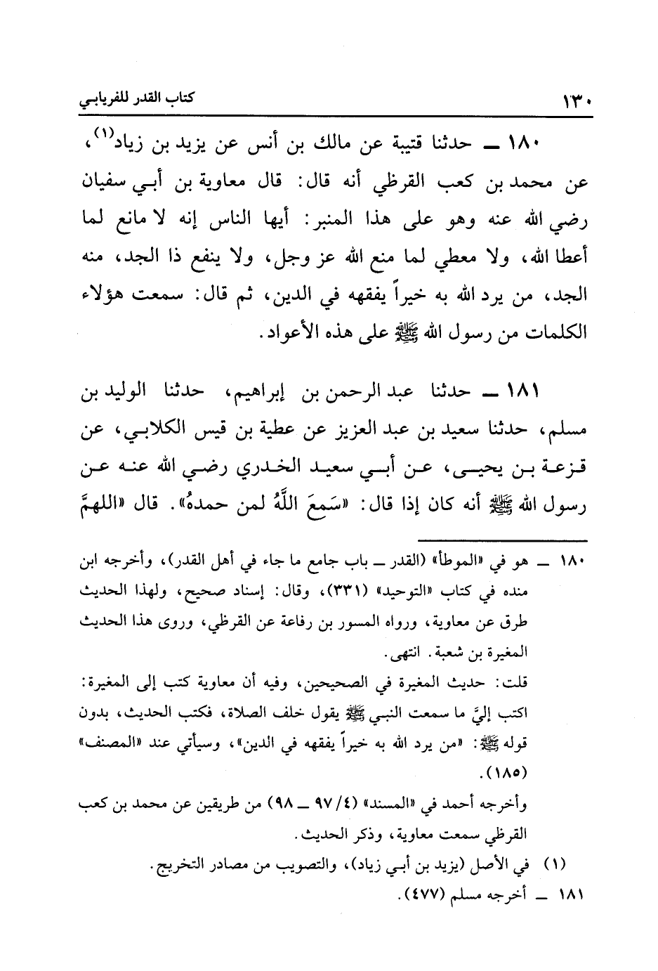 ١٨٠- هو في: الموطأ: القدر- "باب جامع ما جاء في أهل القدر"، وأخرجه ابن منده في كتاب: التوحيد: ٣٣١، وقال: إسناد صحيح، ولهذا الحديث طرق عن معاوية، ورواه المسور بن رفاعة, عن القرظي، وروى هذا الحديث المغيرة بن شعبة. انتهى.