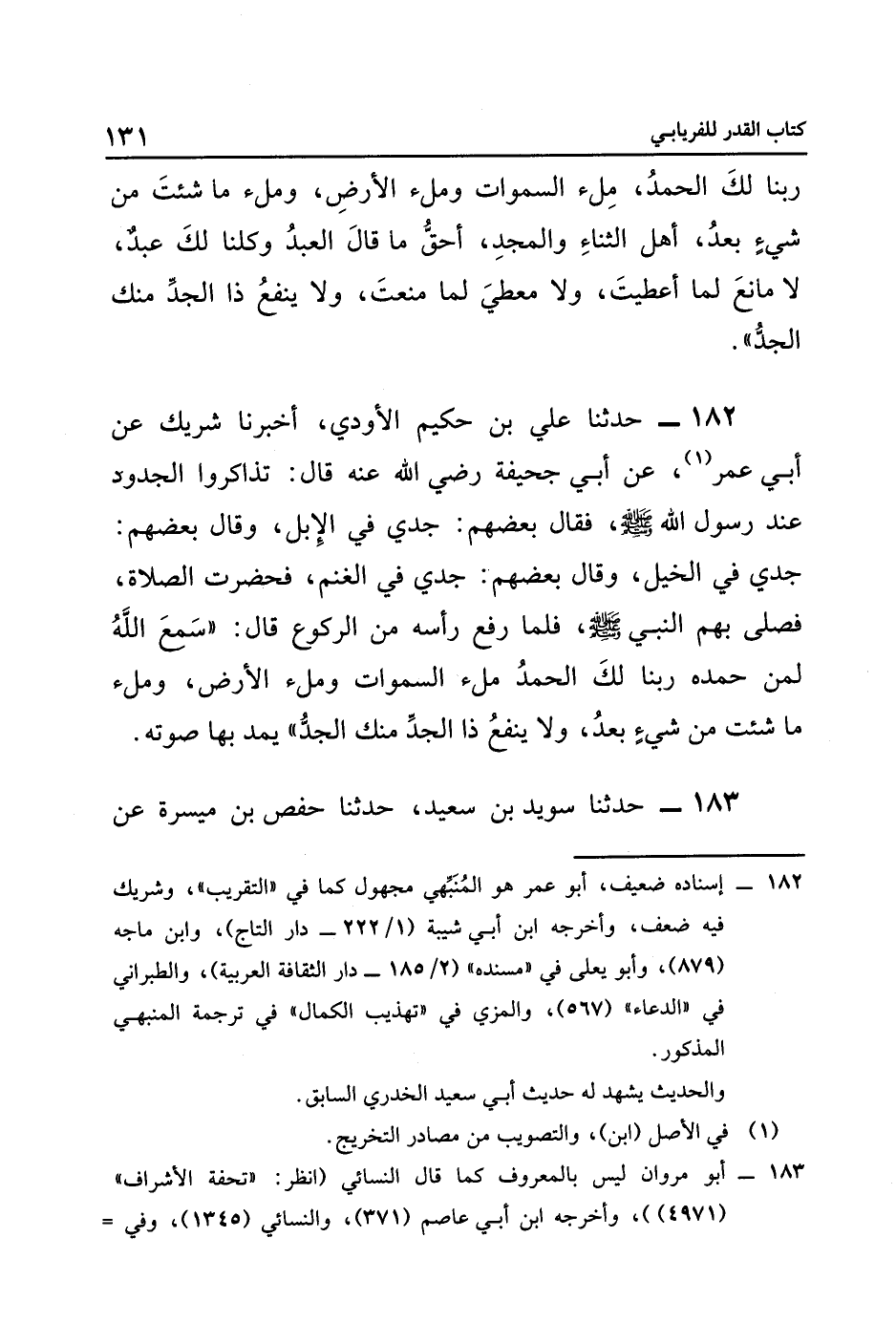 ١٨٢ حَدَّثَنَا عَلِيُّ بْنُ حَكِيمٍ الْأَوْدِيُّ، أَخْبَرَنَا شَرِيكٌ, عَنْ أَبِي عُمَرَ١، عَنْ أَبِي جُحَيْفَةَ رَضِيَ اللَّهُ عَنْهُ, قَالَ: تَذَاكَرُوا الْجُدُودَ عِنْدَ رَسُولِ اللَّهِ صَلَّى اللهُ عَلَيْهِ وَسَلَّمَ، فَقَالَ بَعْضُهُمْ: جَدِّي فِي الْإِبِلِ، وَقَالَ بَعْضُهُمْ: جَدِّي فِي الْخَيْلِ، وَقَالَ بَعْضُهُمْ: جَدِّي فِي الْغَنَمِ، فَحَضَرَتِ الصَّلَاةُ، فَصَلَّى بِهِمُ النَّبِيُّ صَلَّى اللهُ عَلَيْهِ وَسَلَّمَ، فَلَمَّا رَفَعَ رَأْسَهُ مِنَ الرُّكُوعِ قَالَ: "سَمِعَ اللَّهُ لِمِنْ حَمِدَهُ, رَبَّنَا لَكَ الْحَمْدُ, مِلْءَ السَّمَوَاتِ, وَمِلْءَ الْأَرْضِ، وَمِلْءَ مَا شِئْتَ مِنْ شَيْءٍ بَعْدُ، وَلَا يَنْفَعُ ذَا الْجَدِّ مِنْكَ الْجَدُّ", يُمُدُّ بِهَا صَوْتَهُ.
