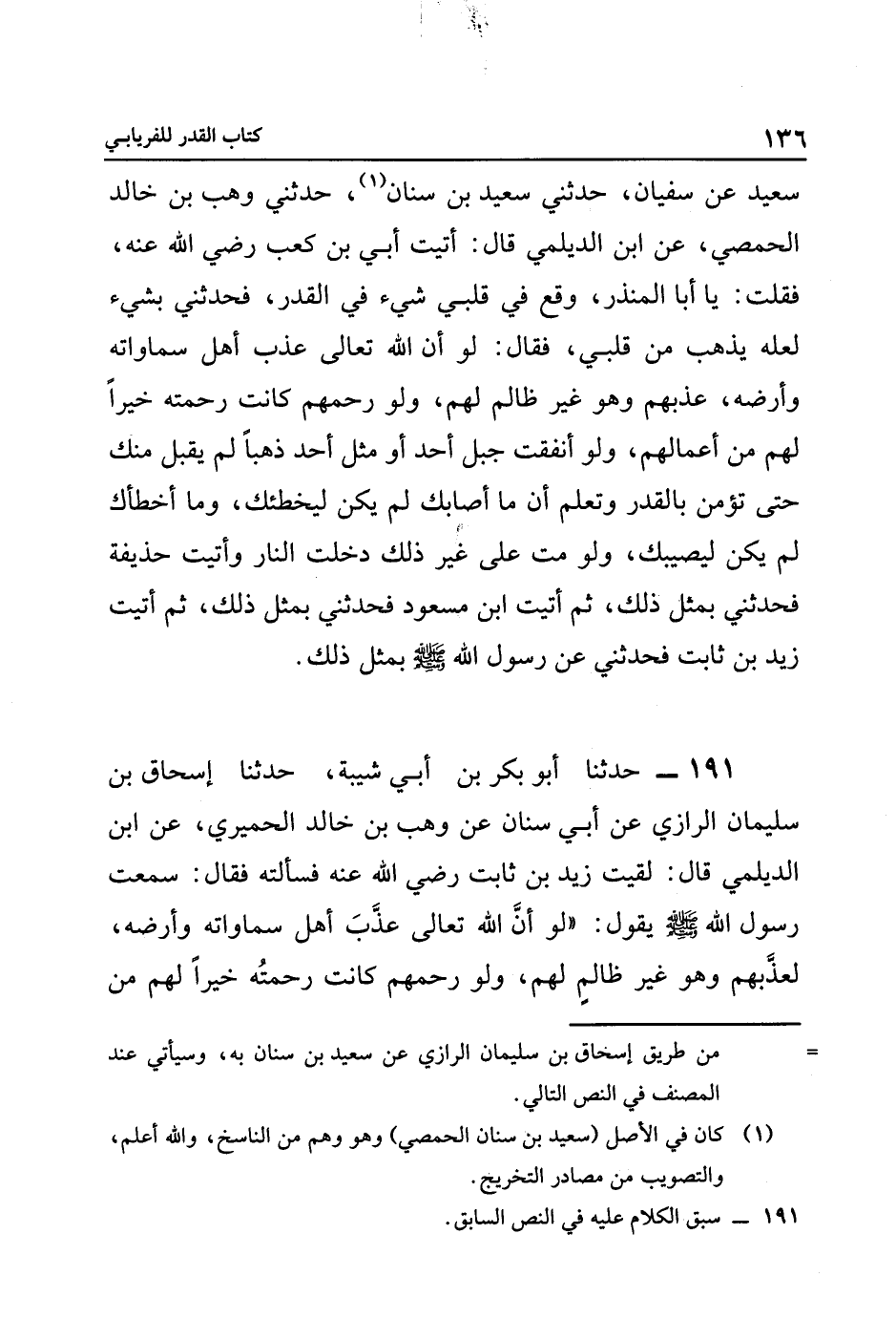 ١٩١ حَدَّثَنَا أَبُو بَكْرِ بْنُ أَبِي شَيْبَةَ، حَدَّثَنَا إِسْحَاقُ بْنُ سُلَيْمَانَ الرَّازِيُّ، عَنْ أَبِي سِنَانٍ، عَنْ وَهْبِ بْنِ خَالِدٍ الْحِمْيرِيِّ، عَنِ ابْنِ الدَّيْلَمِيِّ، قَالَ: لَقِيتُ زَيْدَ بْنَ ثَابِتٍ رَضِيَ اللَّهُ عَنْهُ، فَسَأَلْتُهُ، فَقَالَ: سمعت رسول الله صلى الله عليه وسلم، يَقُولُ: "لَوْ أَنَّ اللَّهَ تَعَالَى عَذَّبَ أَهْلَ سَمَاوَاتِهِ وَأَرْضِهِ، لَعَذَّبَهُمْ وَهُوَ غَيْرُ ظَالِمٍ لَهُمْ، وَلَوْ رَحِمَهُمْ كَانَتْ رَحْمَتُهُ خَيْرًا لَهُمْ مِنْ