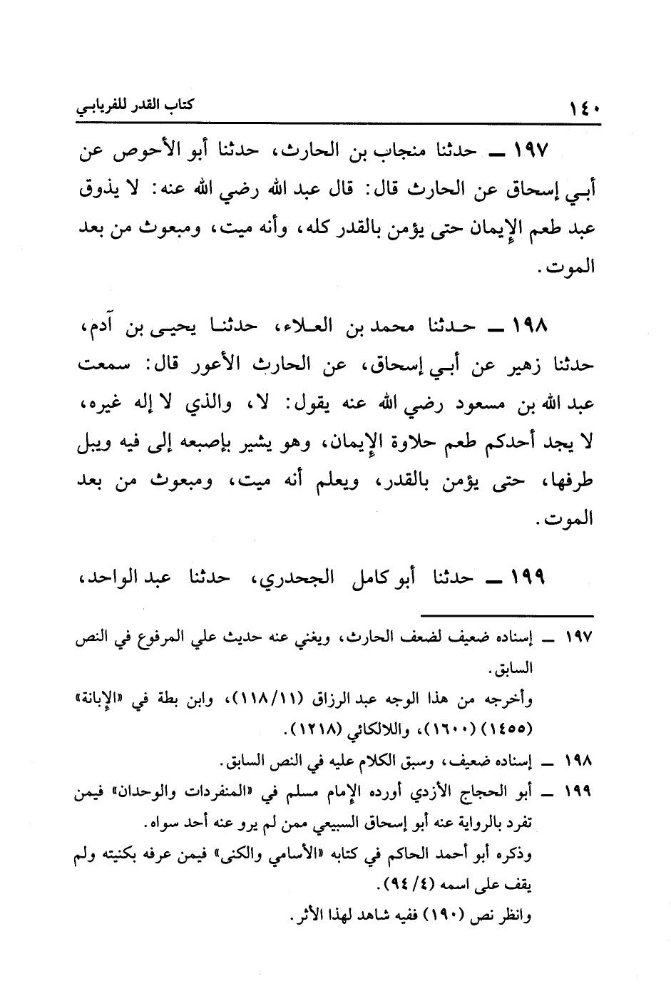 ١٩٨ حَدَّثَنَا مُحَمَّدُ بْنُ الْعَلَاءِ، حَدَّثَنَا يَحْيَى بْنُ آدَمَ، حَدَّثَنَا زُهَيْرٌ، عَنْ أَبِي إِسْحَاقَ، عَنِ الْحَارِثِ الْأَعْوَرِ، قَالَ: سَمِعْتُ عَبْدَ اللَّهِ بْنَ مَسْعُودٍ رَضِيَ اللَّهُ عَنْهُ، يَقُولُ: لَا، وَالَّذِي لَا إِلَهَ غَيْرُهُ، لَا يَجِدُ أَحَدُكُمْ طَعْمَ حَلَاوَةِ الْإِيمَانِ، وَهُوَ يُشِيرُ بِإِصْبَعِهِ إِلَى فِيهِ وَيَبُلُّ طَرَفَهَا، حَتَّى يُؤْمِنَ بِالْقَدَرِ، وَيَعْلَمَ أَنَّهُ مَيِّتٌ، وَمَبْعُوثٌ مِنْ بَعْدِ الْمَوْتِ.