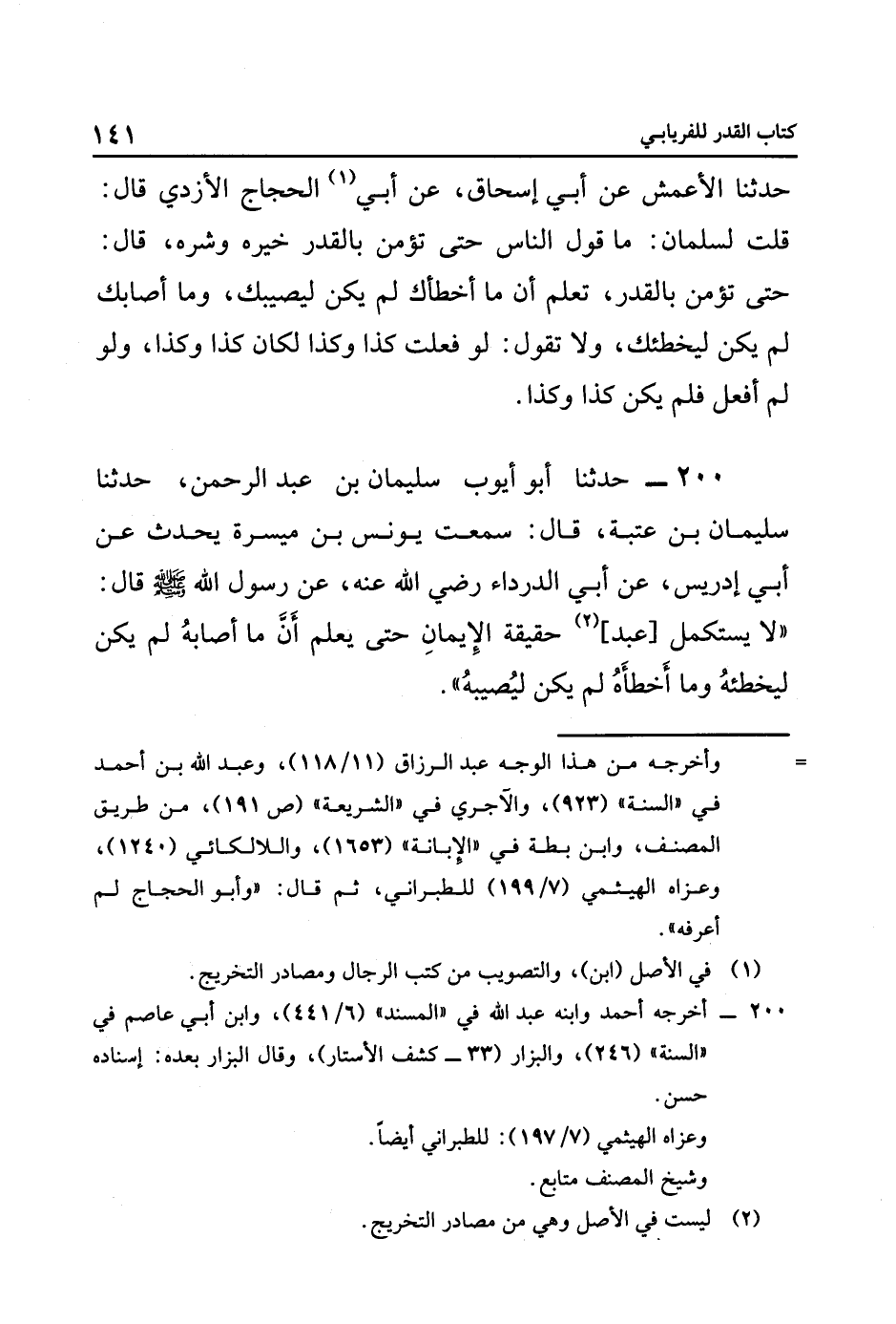 ٢٠٠ حدثنا أبو أيوب سليمان بن عبد الرحمن، حَدَّثَنَا سُلَيْمَانُ بْنُ عُتْبَةَ، قَالَ: سَمِعْتُ يُونُسَ بْنَ مَيْسَرَةَ يُحَدِّثُ عَنْ أَبِي إِدْرِيسَ، عَنْ أبي الدرداء رضي الله عنه، عن رسول اللَّهِ صَلَّى اللهُ عَلَيْهِ وَسَلَّمَ, قَالَ: "لَا يَسْتَكْمِلُ [عَبْدٌ] ٢ حَقِيقَةَ الْإِيمَانِ, حَتَّى يَعْلَمَ أَنَّ مَا أَصَابَهُ لَمْ يَكُنْ لِيُخْطِئَهُ وَمَا أَخْطَأَهُ لم يكن ليصيبه".