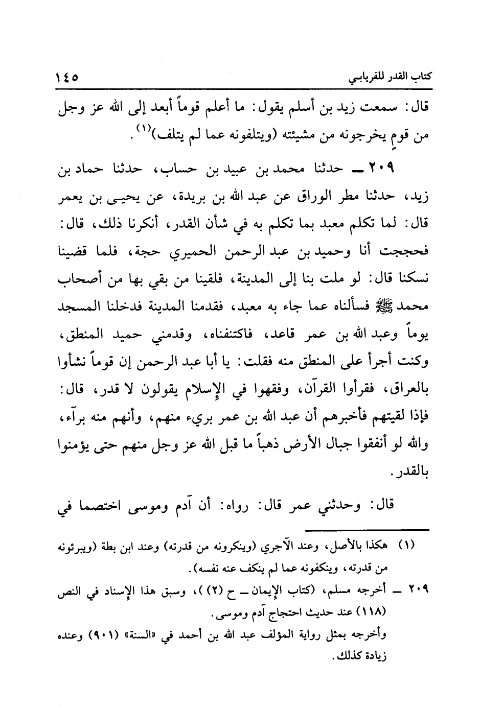 ٢٠٩ حَدَّثَنَا مُحَمَّدُ بْنُ عُبَيْدِ بْنِ حِسَابٍ، حَدَّثَنَا حَمَّادُ بْنُ زَيْدٍ، حَدَّثَنَا مَطَرٌ الْوَرَّاقُ, عَنْ عَبْدِ اللَّهِ بْنِ بُرَيَدَةَ، عَنْ يَحْيَى بْنِ يَعْمُرَ, قَالَ: لَمَّا تَكَلَّمَ مَعْبَدٌ بِمَا تَكَلَّمَ بِهِ فِي شَأْنِ الْقَدَرِ، أَنَّكَرْنَا ذَلِكَ، قَالَ: فَحَجَجْتُ, أَنَا, وَحُمَيْدُ بْنُ عَبْدِ الرَّحْمَنِ الْحِمْيرِيُّ حَجَّةً، فَلَمَّا قَضَيْنَا نُسُكَنَا, قَالَ: لَوْ مِلْتَ بِنَا إِلَى الْمَدِينَةِ، فَلَقِينَا مَنْ بَقِيَ بِهَا مِنْ أَصْحَابِ مُحَمَّدٍ صَلَّى اللهُ عَلَيْهِ وَسَلَّمَ, فَسَأَلْنَاهُ عَمَّا جَاءَ بِهِ مَعْبَدٌ، فَقَدِمْنَا الْمَدِينَةَ, فَدَخَلْنَا الْمَسْجِدَ يَوْمًا, وَعَبْدُ اللَّهِ بْنُ عُمَرَ قَاعِدٌ، فَاكْتَنَفْنَاهُ، وَقَدَّمَنِي حُمَيْدٌ الْمِنْطَقَ، وَكُنْتُ أَجْرَأَ عَلَى الْمِنْطَقِ مِنْهُ فَقُلْتُ: يَا أَبَا عَبْدِ الرَّحْمَنِ إِنَّ قَوْمًا نَشَأُوا بِالْعِرَاقِ، فَقَرَأُوا الْقُرْآنَ، وَفَقِهُوا فِي الْإِسْلَامِ, يَقُولُونَ: لَا قَدَرَ، قَالَ: فَإِذَا لَقِيتَهُمْ, فَأَخْبِرْهُمْ أَنَّ عَبْدَ اللَّهِ بْنَ عُمَرَ بَرِيءٌ مِنْهُمْ، وَأَنَّهُمْ مِنْهُ بُرَآءٌ، وَاللَّهِ لَوْ أَنْفَقُوا جِبَالَ الْأَرْضِ ذَهَبًا مَا قَبِلَ اللَّهُ عَزَّ وَجَلَّ مِنْهُمْ, حَتَّى يُؤْمِنُوا بِالْقَدَرِ.