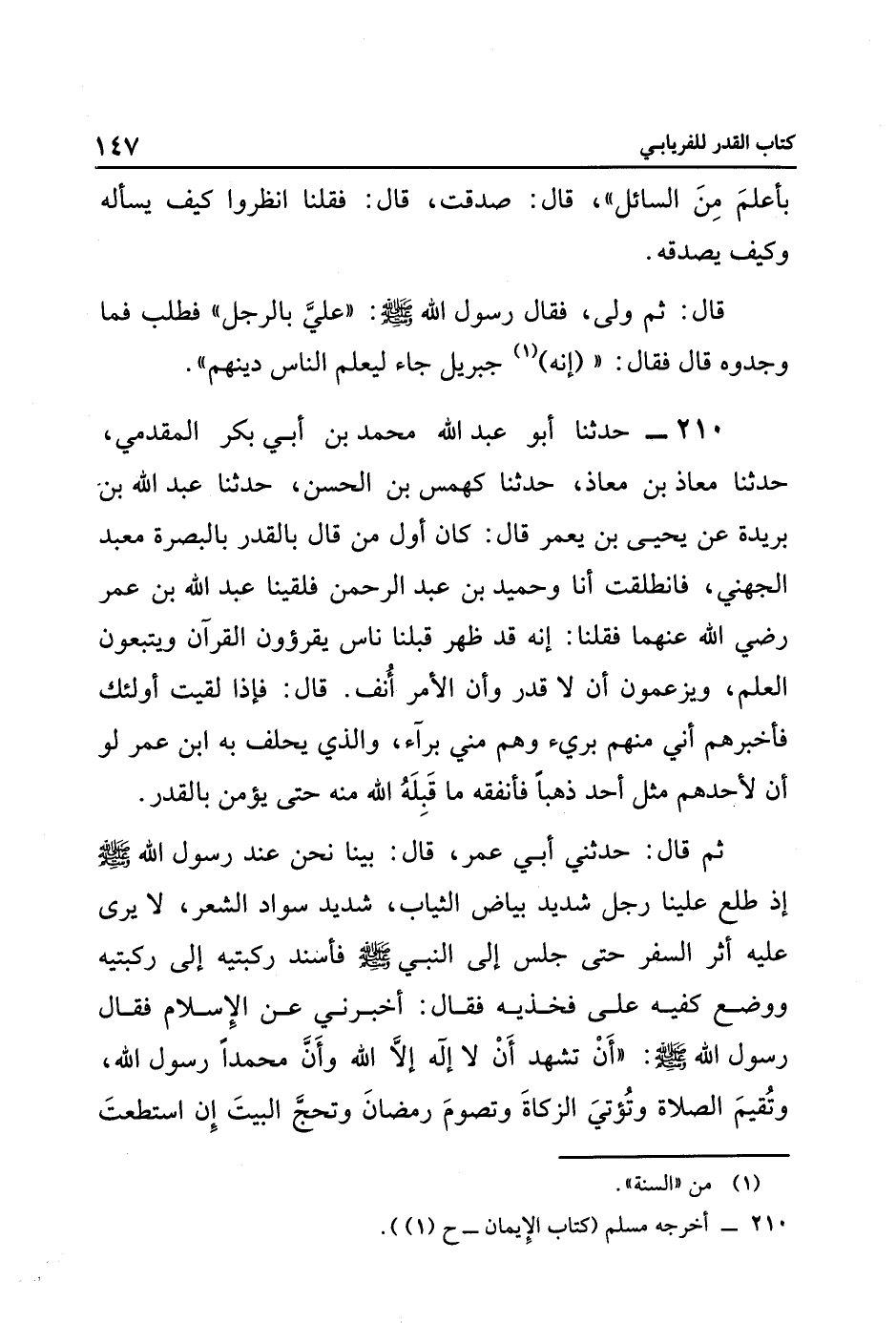 ٢١٠ حَدَّثَنَا أَبُو عَبْدِ اللَّهِ مُحَمَّدُ بْنُ أَبِي بَكْرٍ الْمُقَدَّمِيُّ، حَدَّثَنَا مُعَاذُ بْنُ مُعَاذٍ، حَدَّثَنَا كَهْمَسُ بْنُ الْحَسَنِ، حَدَّثَنَا عَبْدُ اللَّهِ بْنُ بُرَيَدَةَ، عَنْ يَحْيَى بْنِ يَعْمُرَ، قَالَ: كَانَ أَوَّلَ مَنْ قَالَ بِالْقَدَرِ بِالْبَصْرَةِ مَعْبَدٌ الْجُهَنِيُّ، فَانْطَلَقْتُ أَنَا وَحُمَيْدُ بْنُ عَبْدِ الرَّحْمَنِ فَلَقِينَا عَبْدَ اللَّهِ بْنَ عُمَرَ رَضِيَ اللَّهُ عَنْهُمَا، فَقُلْنَا: إنه قد ظهر قبلنا ناس يقرؤون القرآن، وَيَتَّبِعُونَ الْعِلْمَ، وَيَزْعُمُونَ أَنْ لَا قَدَرَ وَأَنَّ الْأَمْرَ أُنُفٌ، قَالَ: فَإِذَا لَقِيتَ أُولَئِكَ فَأَخْبِرْهُمْ أَنِّي مِنْهُمْ بَرِيءٌ، وَهُمْ مِنِّي بَرَآءٌ، وَالَّذِي يَحْلِفُ بِهِ ابْنُ عُمَرَ لَوْ أَنَّ لِأَحَدِهِمْ مِثْلَ أُحُدٍ ذَهَبًا, فَأَنْفَقَهُ, مَا قَبِلَهُ اللَّهُ مِنْهُ حَتَّى يُؤْمِنَ بِالْقَدَرِ.