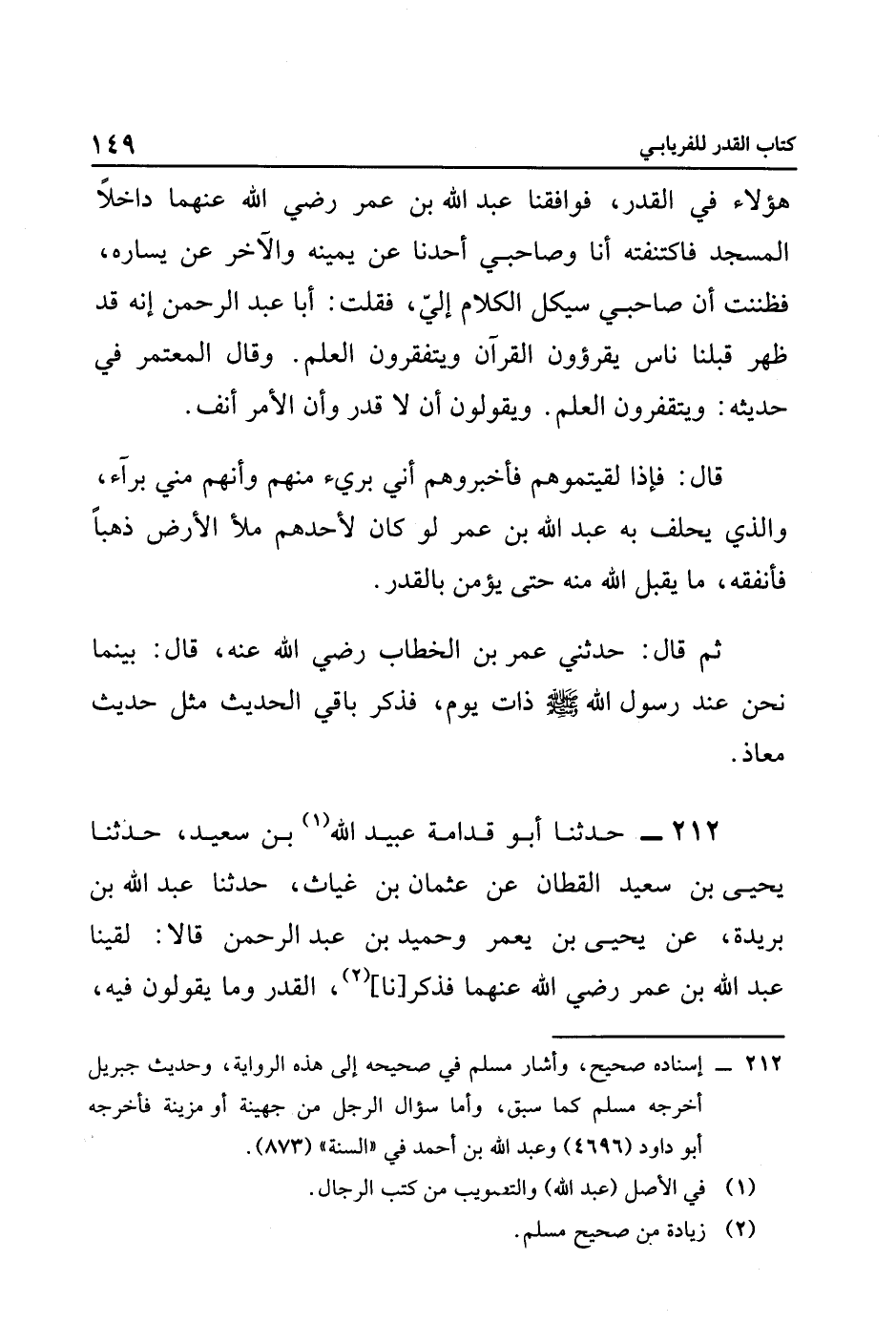 ٢١٢ حَدَّثَنَا أَبُو قُدَامَةَ عُبَيْدُ اللَّهِ١ بْنُ سَعِيدٍ، حَدَّثَنَا يَحْيَى بْنُ سَعِيدٍ الْقَطَّانُ, عَنْ عُثْمَانَ بْنِ غِيَاثٍ، حَدَّثَنَا عبد الله بن بريدة، عن يحيى بن يَعْمُرَ, وَحُمَيْدِ بْنِ عَبْدِ الرَّحْمَنِ, قَالَا: لَقِينَا عبد الله بن عمر رضي الله عنهما, فذكر [نا] ٢، القدر, وما يقولون فيه،