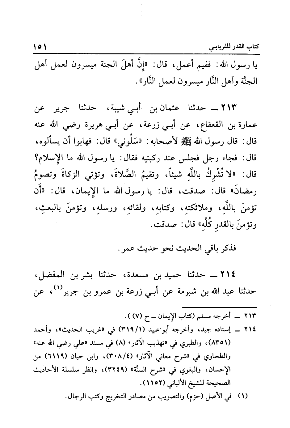 ٢١٣ حَدَّثَنَا عُثْمَانُ بْنُ أَبِي شَيْبَةَ، حَدَّثَنَا جَرِيرٌ, عَنْ عُمَارَةَ بْنِ الْقَعْقَاعِ، عَنْ أَبِي زَرْعَةَ، عَنْ أَبِي هُرَيْرَةَ رَضِيَ اللَّهُ عَنْهُ, قَالَ: قَالَ رَسُولُ اللَّهِ صَلَّى اللهُ عَلَيْهِ وَسَلَّمَ لِأَصْحَابِهِ: "سَلُونِي" قَالَ: فَهَابُوا أَنْ يَسْأَلُوهُ، قَالَ: فَجَاءَ رَجُلٌ, فَجَلَسَ عِنْدَ رُكْبَتَيْهِ, فَقَالَ: يَا رَسُولَ اللَّهِ مَا الْإِسْلَامُ؟ , قَالَ: "لَا تُشْرِكْ بِاللَّهِ شَيْئًا، وَتُقِيمُ الصَّلَاةَ، وَتُؤْتِي الزَّكَاةَ وَتَصُومُ رَمَضَانَ", قَالَ: صَدَقْتَ، قَالَ: يَا رَسُولَ اللَّهِ, مَا الْإِيمَانُ؟، قَالَ: "أَنْ تُؤْمِنَ بِاللَّهِ، وَمَلَائِكَتِهِ، وَكِتَابِهِ، وَلِقَائِهِ، وَرُسُلِهِ، وَتُؤْمِنَ بِالْبَعْثِ، وَتُؤْمِنَ بِالْقَدَرِ كُلِّهِ" قَالَ: صَدَقْتَ.