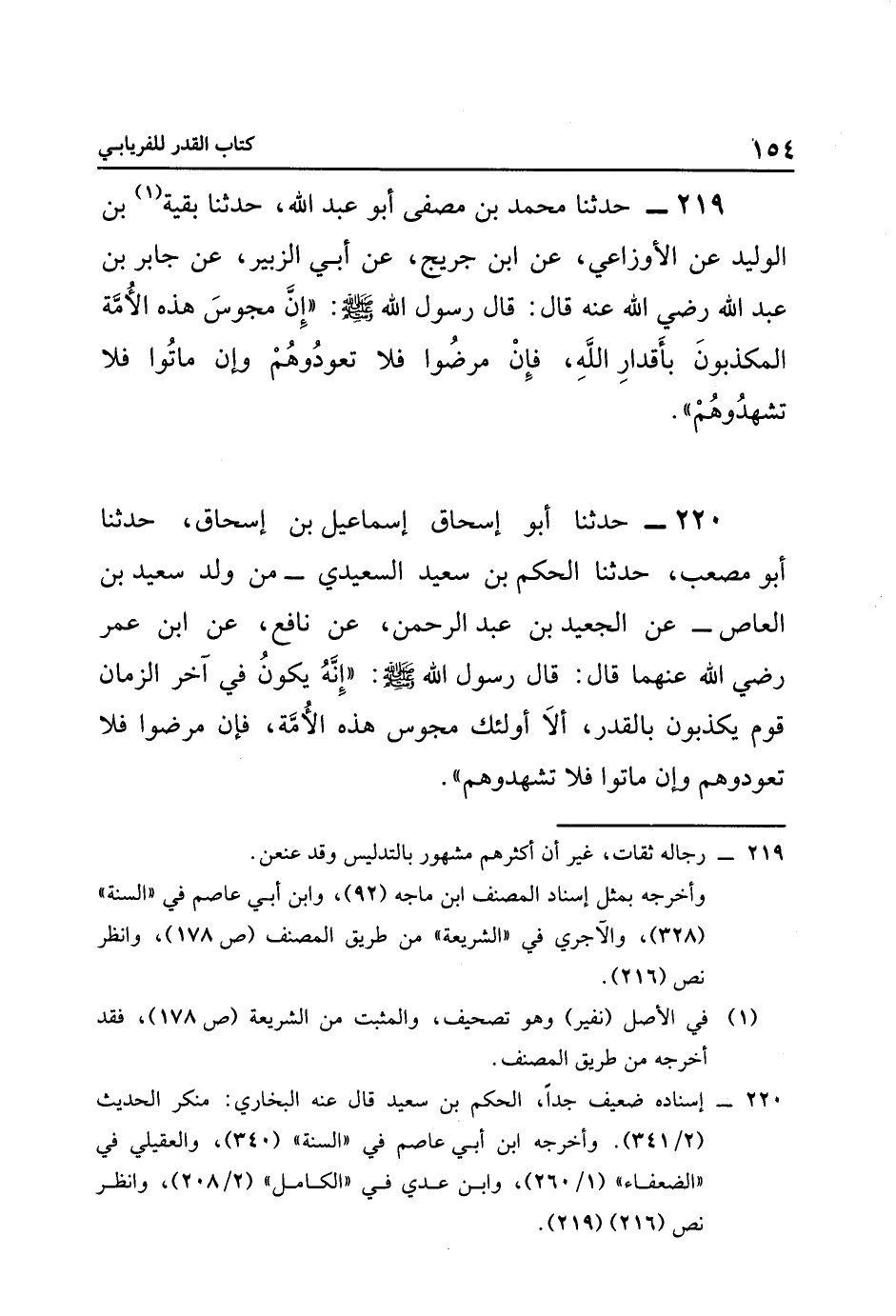 ٢١٩ حَدَّثَنَا مُحَمَّدُ بْنُ مُصَفَّى أَبُو عَبْدِ اللَّهِ، حَدَّثَنَا بَقِيَّةُ١ بْنُ الْوَلِيدِ, عَنِ الْأَوْزَاعِيِّ، عَنِ ابْنِ جُرَيْجٍ، عَنْ أَبِي الزُّبَيْرِ، عَنْ جَابِرِ بْنِ عَبْدِ اللَّهِ رَضِيَ اللَّهُ عَنْهُ, قَالَ: قَالَ رَسُولُ اللَّهِ صَلَّى اللهُ عَلَيْهِ وَسَلَّمَ: "إِنَّ مَجُوسَ هَذِهِ الْأُمَّةِ الْمُكَذِّبُونَ بِأَقْدَارِ اللَّهِ، فَإِنْ مَرِضُوا, فَلَا تَعُودُوهُمْ, وَإِنْ مَاتُوا, فَلَا تَشْهَدُوهُمْ".