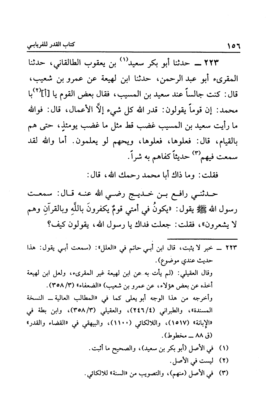 ٢٢٣ حَدَّثَنَا أَبُو بَكْرٍ سَعِيدُ١ بْنُ يَعْقُوبَ الطَّالْقَانِيُّ، حدثنا المقرئ أَبُو عَبْدِ الرَّحْمَنِ، حَدَّثَنَا ابْنُ لَهِيعَةَ عَنْ عمرو بن شعيب، قال: كنت جالسا عند سَعِيدِ بْنِ الْمُسَيِّبِ، فَقَالَ بَعْضُ الْقَوْمِ: يَا [أ] ٢ با مُحَمَّدٍ, إِنَّ قَوْمًا يَقُولُونَ: قَدَّرَ اللَّهُ كُلَّ شَيْءٍ إِلَّا الْأَعْمَالَ، قَالَ: فَوَاللَّهِ مَا رَأَيْتُ سَعِيدَ بْنَ الْمُسَيِّبِ غَضِبَ قَطُّ, مِثْلَ مَا غضب يؤمئذٍ، حَتَّى همَّ بِالْقِيَامِ، قَالَ: فَعَلُوهَا، فَعَلُوهَا، وَيْحَهُمْ لَوْ يَعْلَمُونَ. أَمَا وَاللَّهِ لَقَدْ سَمِعْتُ فِيهِمْ٣ حَدِيثًا كَفَاهُمْ بِهِ شَرًّا.