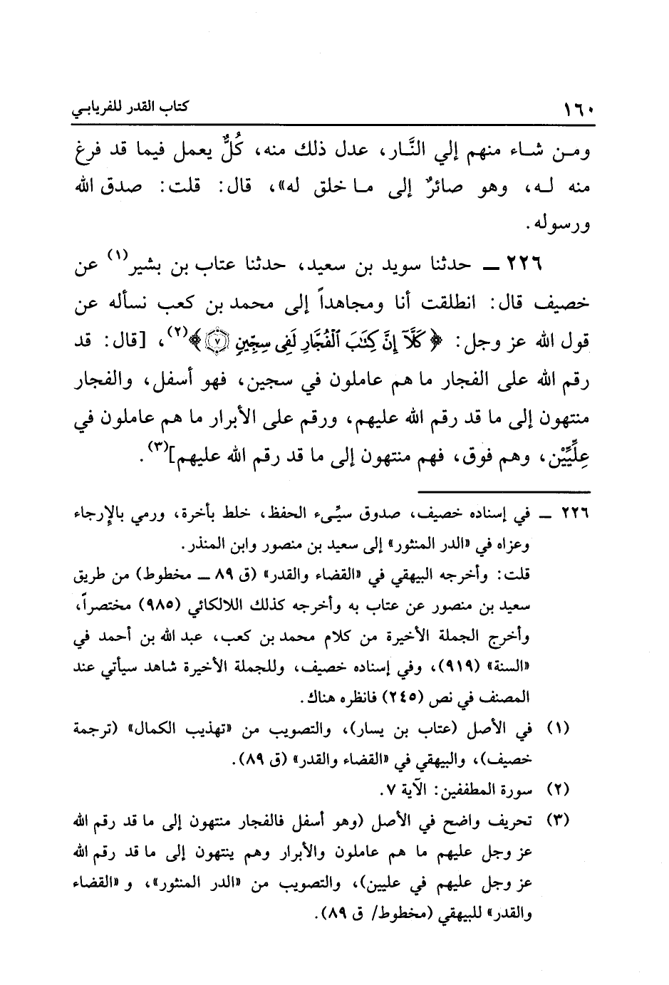 ٢٢٦ حَدَّثَنَا سُوَيْدُ بْنُ سَعِيدٍ، حَدَّثَنَا عَتَّابُ بْنُ بَشِيرٍ١، عَنْ خصيف، قال: انطلقت أنا ومجاهداً إِلَى مُحَمَّدِ بْنِ كَعْبٍ، نَسْأَلَهُ عَنْ قَوْلِ اللَّهِ عَزَّ وَجَلَّ: {كَلَاّ إِنَّ كِتَابَ الفُجَّارِ لَفِي سِجِّينٍ} ٢، [قَالَ: قَدْ رَقَمَ اللَّهُ عَلَى الْفُجَّارِ مَا هُمْ عَامِلُونَ فِي سِجِّينٍ، فَهُوَ أَسْفَلُ، وَالْفُجَّارُ مُنْتَهُوَنَ إِلَى مَا قَدْ رَقَمَ اللَّهُ عَلَيْهِمْ، وَرَقَمَ عَلَى الْأَبْرَارِ مَا هُمْ عَامِلُونَ فِي عِلِّيِّينَ، وَهُمْ فَوْقَ، فَهُمْ مُنْتَهُوَنَ إِلَى مَا قد رقم الله عليهم] ٣.