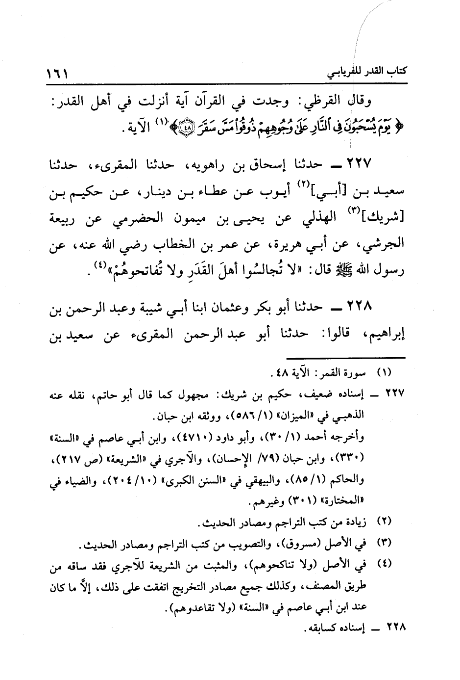 ٢٢٧ حَدَّثَنَا إِسْحَاقُ بْنُ رَاهَوَيْهِ، حَدَّثَنَا الْمُقْرِيءُ، حَدَّثَنَا سَعِيدُ بْنُ [أَبِي] ٢ أَيُّوبَ, عَنْ عَطَاءِ بْنِ دِينَارٍ، عَنْ حَكِيمِ بْنِ [شَرِيكٍ] ٣ الْهُذَلِيِّ، عَنْ يَحْيَى بْنِ مَيْمُونٍ الْحَضْرَمِيِّ، عَنْ رَبِيعَةَ الْجُرَشِيِّ، عَنْ أَبِي هُرَيْرَةَ، عَنْ عُمَرَ بْنِ الْخَطَّابِ رَضِيَ اللَّهُ عَنْهُ، عَنْ رَسُولِ اللَّهِ صَلَّى اللهُ عَلَيْهِ وَسَلَّمَ، قَالَ: "لَا تُجَالِسُوا أهل القدر، ولاتفاتحوهم" ٤.