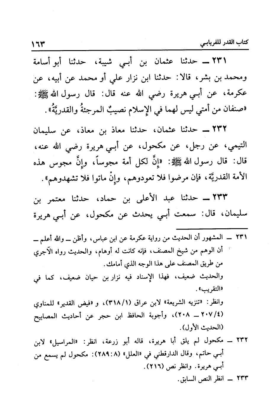 ٢٣٢ حَدَّثَنَا عُثْمَانُ، حَدَّثَنَا مُعَاذُ بْنُ مُعَاذٍ، عَنْ سُلَيْمَانَ التَّيْمِيِّ، عَنْ رَجُلٍ، عَنْ مَكْحُولٍ، عَنْ أَبِي هُرَيْرَةَ رَضِيَ اللَّهُ عَنْهُ، قَالَ: قَالَ رَسُولُ اللَّهِ صَلَّى اللهُ عَلَيْهِ وَسَلَّمَ: "إِنَّ لِكُلِّ أُمَّةٍ مَجُوسًا، وَإِنَّ مَجُوسَ هَذِهِ الْأُمَّةِ الْقَدَرِيَّةُ، فَإِنْ مَرِضُوا فَلَا تَعُودُوهُمْ، وَإِنْ مَاتُوا، فَلَا تَشْهَدُوهُمْ".