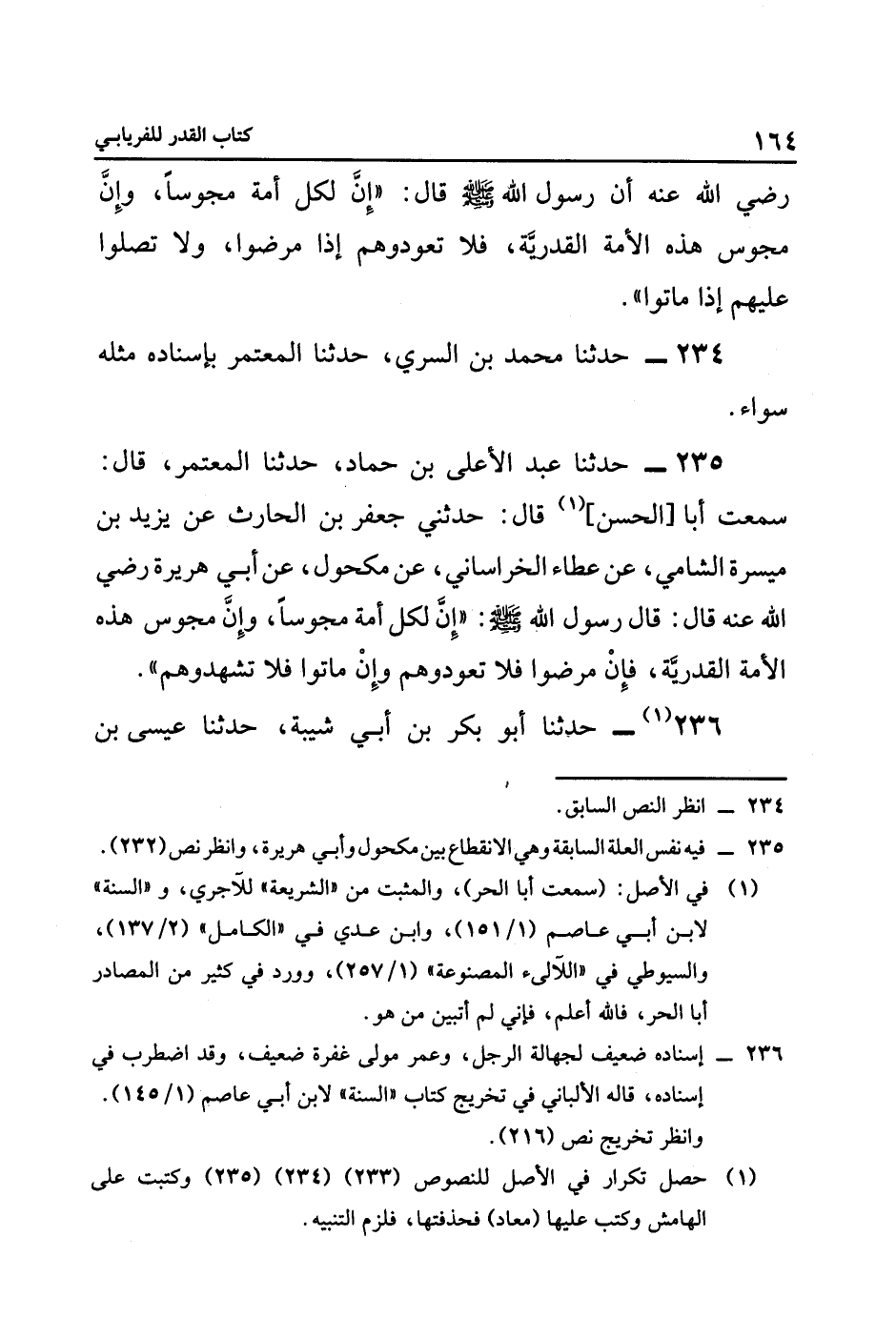 ٢٣٥ حَدَّثَنَا عَبْدُ الْأَعْلَى بْنُ حَمَّادٍ، حَدَّثَنَا الْمُعْتَمِرُ، قَالَ: سَمِعْتُ أَبَا [الْحَسَنِ] ١، قَالَ: حَدَّثَنِي جَعْفَرُ بْنُ الْحَارِثِ، عَنْ يَزِيدَ بْنِ مَيْسَرَةَ الشَّامِيِّ، عَنْ عَطَاءٍ الْخُرَاسَانِيِّ، عَنْ مَكْحُولٍ، عَنْ أَبِي هُرَيْرَةَ رَضِيَ اللَّهُ عَنْهُ، قَالَ: قَالَ رَسُولُ اللَّهِ صَلَّى اللهُ عَلَيْهِ وَسَلَّمَ: "إِنَّ لِكُلِّ أُمَّةٍ مَجُوسًا، وَإِنَّ مَجُوسَ هَذِهِ الْأُمَّةِ الْقَدَرِيَّةُ، فَإِنْ مَرِضُوا، فَلَا تَعُودُوهُمْ، وَإِنْ مَاتُوا، فَلَا تَشْهَدُوهُمْ".
