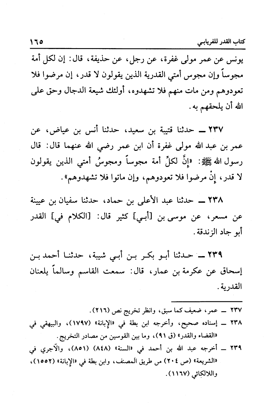 ٢٣٧ حَدَّثَنَا قُتَيْبَةُ بْنُ سَعِيدٍ، حَدَّثَنَا أَنَسُ بْنُ عِيَاضٍ، عَنْ عُمَرَ بْنِ عَبْدِ اللَّهِ مَوْلَى غُفْرَةَ، أَنَّ ابْنَ عُمَرَ رَضِيَ اللَّهُ عَنْهُمَا، قَالَ: قَالَ رَسُولُ اللَّهِ صلى الله عليهم وَسَلَّمَ: "إِنَّ لِكُلِّ أُمَّةٍ مَجُوسًا، وَمَجُوسُ أُمَّتِي الَّذِينَ يَقُولُونَ: لَا قَدَرَ، إِنْ مَرِضُوا، فَلَا تَعُودُوهُمْ، وَإِنْ مَاتُوا، فَلَا تَشْهَدُوهُمْ".