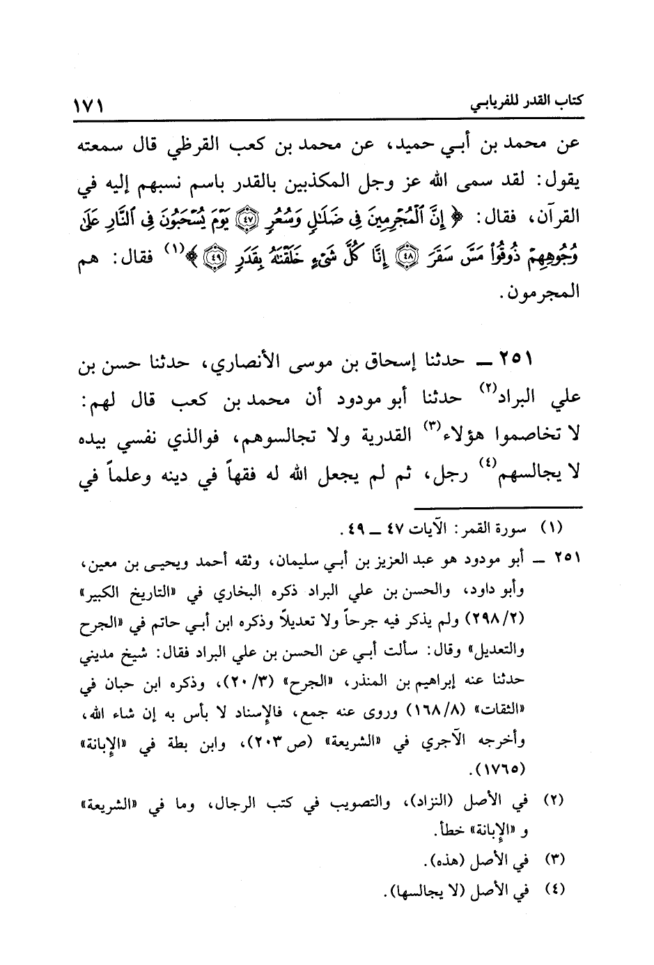 ٢٥١ حَدَّثَنَا إِسْحَاقُ بْنُ مُوسَى الْأَنْصَارِيُّ، حَدَّثَنَا حَسَنُ بْنُ عَلِيٍّ الْبَرَّادُ٢, حَدَّثَنَا أَبُو مَوْدُودٍ, أَنَّ مُحَمَّدَ بْنَ كَعْبٍ قَالَ لهم: لا تخاصموا هؤلاء٣ القدرية, ولا تجسالوهم، فَوَالَّذِي نَفْسِي بِيَدِهِ لَا يُجَالِسُهُمْ٤ رَجُلٌ، ثُمَّ لَمْ يَجْعَلِ اللَّهُ لَهُ فِقْهًا فِي دِينِهِ, وعلمًا في