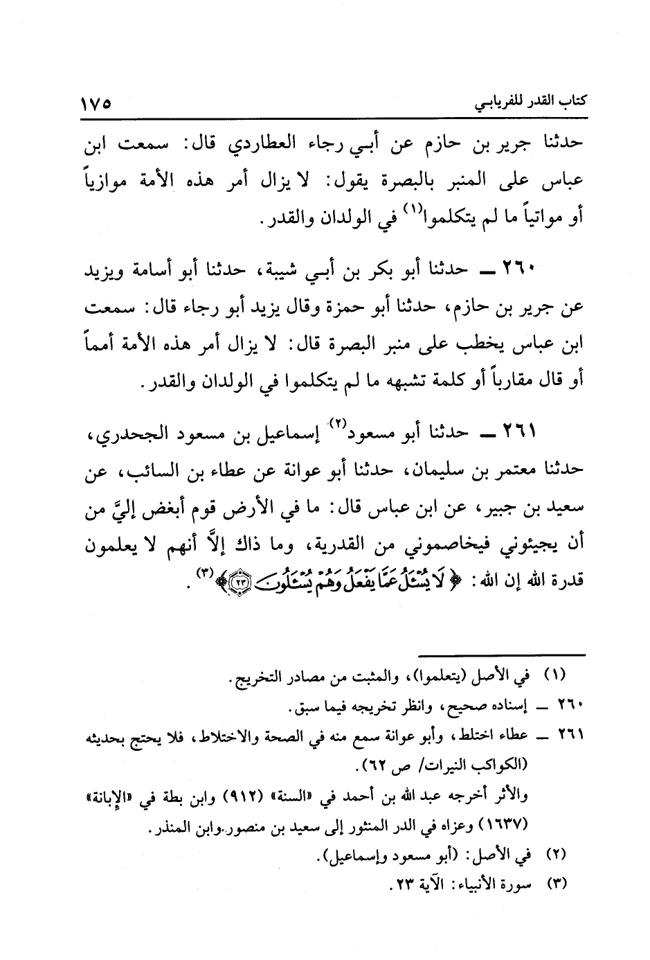 ٢٦١ حَدَّثَنَا أَبُو مَسْعُودٍ٢ إِسْمَاعِيلُ بْنُ مَسْعُودٍ الْجَحْدَرِيُّ، حَدَّثَنَا مُعْتَمِرُ بْنُ سُلَيْمَانَ، حَدَّثَنَا أَبُو عَوَانَةَ, عَنْ عَطَاءِ بْنِ السَّائِبِ، عَنْ سَعِيدِ بْنِ جُبَيْرٍ، عَنِ ابْنِ عَبَّاسٍ, قَالَ: مَا فِي الْأَرْضِ قَوْمٌ أَبْغَضُ إليَّ مِنْ أَنْ يَجْيئُونِي, فَيُخَاصِمُونِي, مِنَ الْقَدَرِيَّةَ؛ وَمَا ذَاكَ إِلَّا أَنَّهُمْ لَا يَعْلَمُونَ قُدْرَةَ اللَّهِ, إِنَّ اللَّهَ: {لا يُسْأَلُ عَمَّا يَفْعَلُ وَهُمْ يُسْأَلُونَ} ٣.