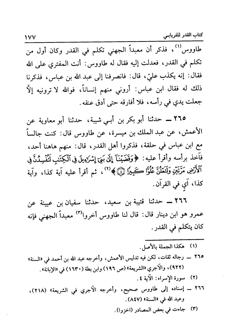 ٢٦٥ حَدَّثَنَا أَبُو بَكْرِ بْنُ أَبِي شَيْبَةَ، حَدَّثَنَا أَبُو مُعَاوِيَةَ, عَنِ الْأَعْمَشِ، عَنْ عبد الملك بن ميسرة، عن طاووس, قَالَ: كُنْتُ جَالِسًا مَعَ ابْنِ عَبَّاسٍ فِي حَلْقَةٍ، فَذَكَرُوا أَهْلَ الْقَدَرِ، قَالَ: مِنْهُمْ هَاهُنَا أَحَدٌ؟، فَأَخَذَ بِرَأْسِهِ وَأَقْرَأَ عَلَيْهِ: {وَقَضَيْنَا إِلَى بَنِي إسْرائِيلَ فِي الْكِتَابِ لَتُفْسِدُنَّ فِي الأَرْضِ مَرَّتَيْنِ وَلَتَعْلُنَّ عُلُوّاً كَبِيراً} ٤، ثُمَّ أَقْرَأَ عَلَيْهِ آيَةَ كَذَا، وَآيَةَ كَذَا، آيٍ فِي الْقُرْآنِ.