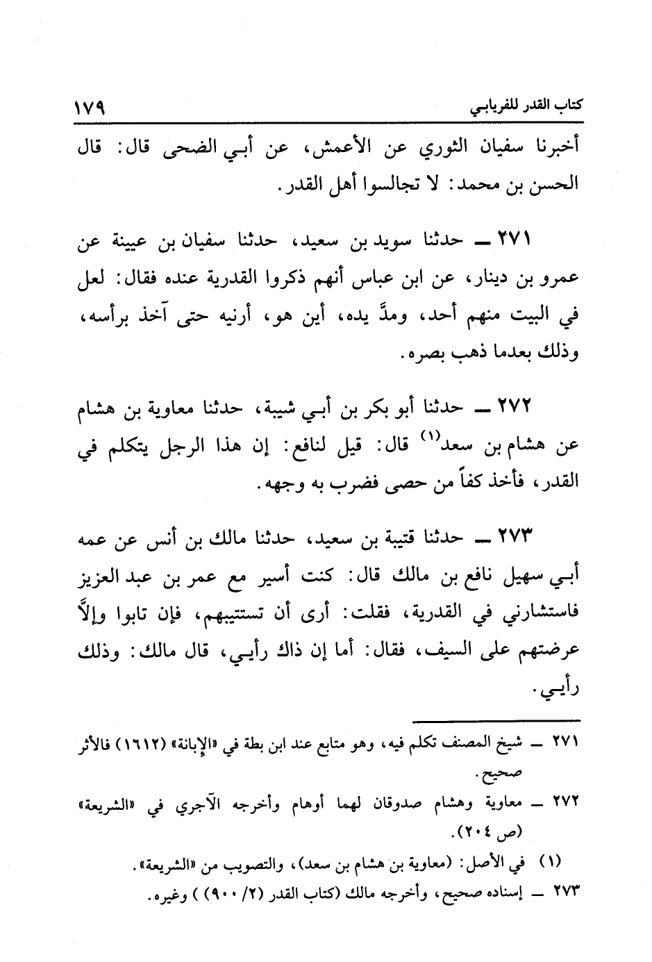 ٢٧٢ حَدَّثَنَا أَبُو بَكْرِ بْنُ أَبِي شيبة، مُعَاوِيَةُ بْنُ هِشَامٍ, عَنْ هِشَامِ بْنِ سَعْدٍ١, قَالَ: قِيلَ لِنَافِعٍ: إِنَّ هَذَا الرَّجُلَ يَتَكَلَّمُ فِي الْقَدَرِ، فَأَخَذَ كَفًّا مِنْ حَصَى, فَضَرَبَ بِهِ وَجْهَهُ.
