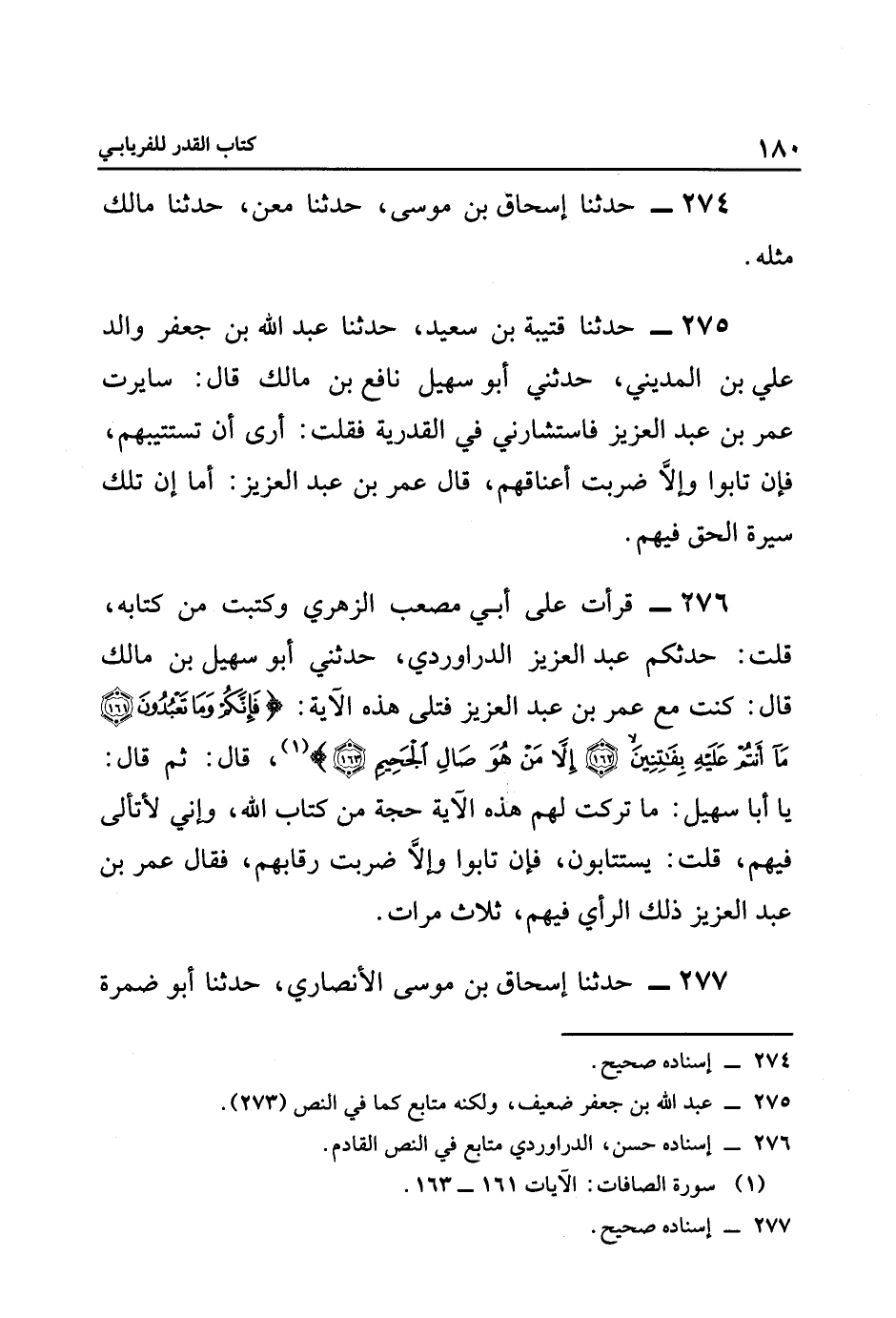 ٢٧٦ قَرَأْتُ عَلَى أَبِي مُصْعَبٍ الزُّهْرِيِّ, وَكَتَبْتُ مِنْ كِتَابِهِ، قُلْتُ: حَدَّثَكُمْ عَبْدُ الْعَزِيزِ الدَّرَاوَرْدِيُّ، حَدَّثَنِي أَبُو سُهَيْلِ بْنُ مَالِكٍ, قَالَ: كُنْتُ مَعَ عُمَرَ بْنِ عَبْدِ الْعَزِيزِ, فَتَلَى هَذِهِ الْآيَةَ: {فَإِنَّكُمْ وَمَا تَعْبُدُونَ مَا أَنْتُمْ عَلَيْهِ بِفَاتِنِينَ إِلَاّ مَنْ هُوَ صَالِي الْجَحِيمِ} ١، قَالَ: ثُمَّ قَالَ: يَا أَبَا سُهَيْلٍ: مَا تَرَكَتْ لَهُمْ هَذِهِ الْآيَةُ حُجَّةً مِنْ كِتَابِ اللَّهِ، وَإِنِّي لَأَتَأَلَّى فِيهِمْ، قُلْتُ: يُسْتَتَابُونَ، فَإِنْ تَابُوا, وَإِلَّا ضُرِبَتْ رِقَابُهُمْ، فَقَالَ عُمَرُ بْنُ عَبْدِ الْعَزِيزِ: ذَلِكَ الرَّأْيَ فِيهِمْ، ثَلَاثَ مَرَّاتٍ.