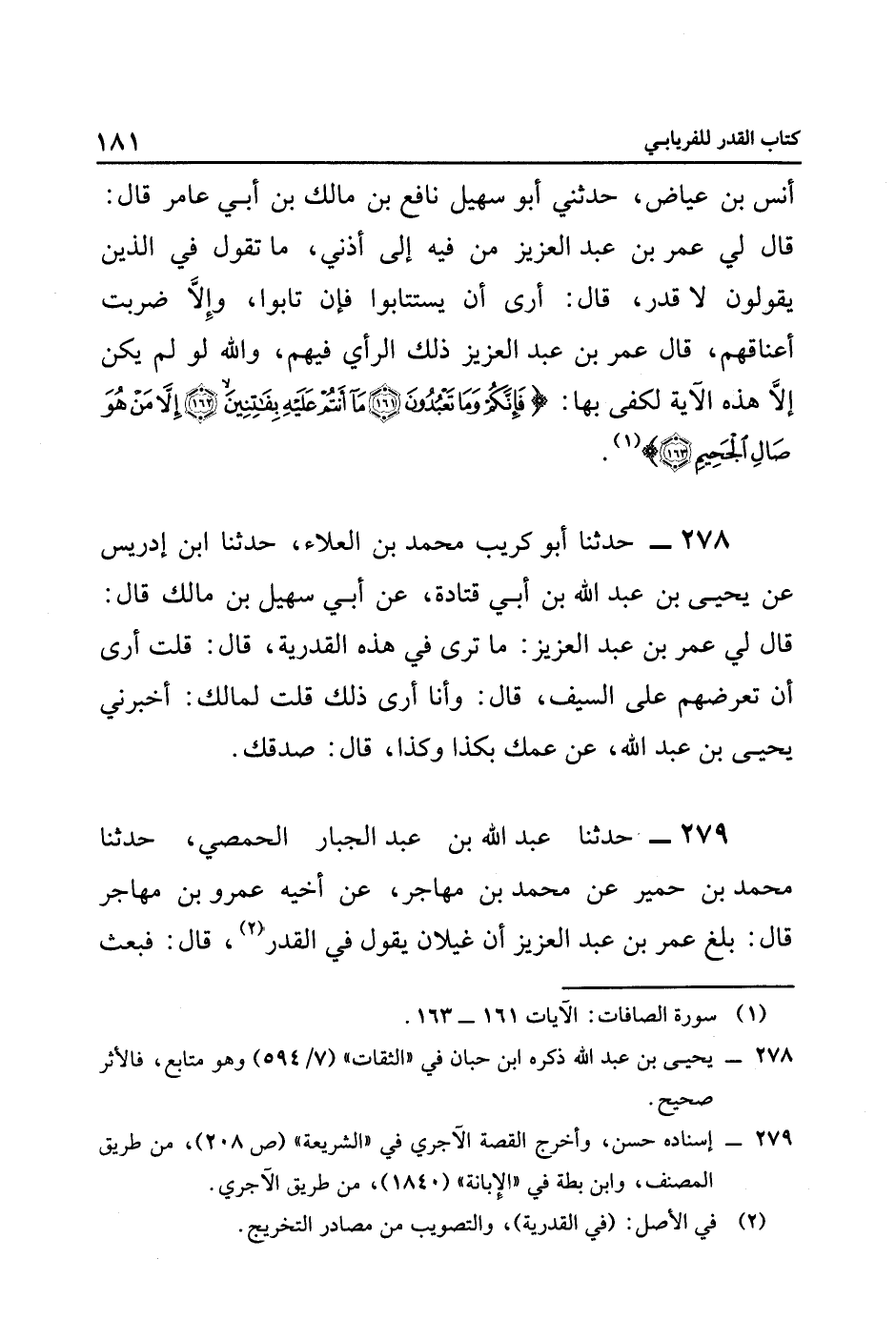 أَنَسُ بْنُ عِيَاضٍ، حَدَّثَنِي أَبُو سُهَيْلٍ نَافِعُ بْنُ مَالِكِ بْنُ أَبِي عَامِرٍ, قَالَ: قَالَ لِي عُمَرُ بْنُ عَبْدِ الْعَزِيزِ, مِنْ فِيهِ إِلَى أُذُنِي: مَا تَقُولُ فِي الَّذِينَ يَقُولُونَ: لَا قَدَرَ؟، قَالَ: أَرَى أَنْ يُسْتَتَابُوا, فَإِنْ تابوا، وإلا ضربت أعناقهم، قال عمر بن عَبْدِ الْعَزِيزِ: ذَلِكَ الرَّأْي فِيهِمْ، وَاللَّهِ لَوْ لَمْ يَكُنْ إِلَّا هَذِهِ الْآيَةَ, لَكَفَى بِهَا: {فَإِنَّكُمْ وَمَا تَعْبُدُونَ مَا أَنْتُمْ عَلَيْهِ بِفَاتِنِينَ إِلَاّ مَنْ هُوَ صَالِي الْجَحِيمِ} ١.