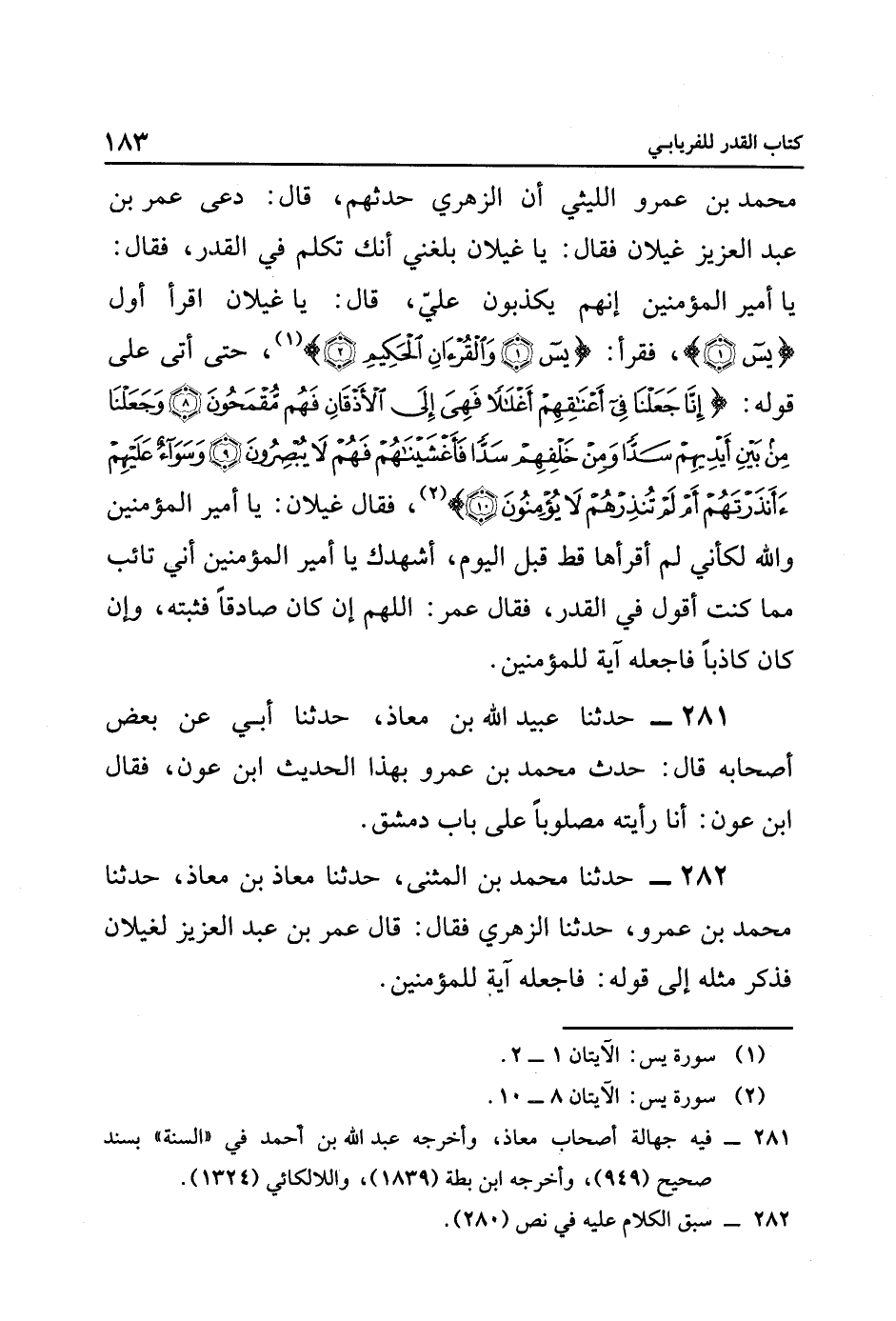 مُحَمَّدُ بْنُ عَمْرٍو اللَّيْثِيُّ, أَنَّ الزُّهْرِيَّ حَدَّثَهُمْ، قال: دعى عُمَرُ بْنُ عَبْدِ الْعَزِيزِ غَيْلَانَ, فَقَالَ: يَا غَيْلَانُ, بَلَغَنِي أَنَّكَ تَكَلَّمُ فِي الْقَدَرِ، فَقَالَ: يَا أَمِيرَ الْمُؤْمِنِينَ, إِنَّهُمْ يَكْذِبُونَ عَلَيَّ، قَالَ: يَا غَيْلَانُ, اقْرَأْ أَوَّلَ يس، فَقَرَأَ: {يس وَالْقُرْآنِ الْحَكِيمِ} ١، حَتَّى أَتَى عَلَى قَوْلِهِ: {إِنَّا جَعَلْنَا فِي أَعْنَاقِهِمْ أَغْلالاً فَهِيَ إِلَى الأَذْقَانِ فَهُمْ مُقْمَحُونَ وَجَعَلْنَا مِنْ بَيْنِ أَيْدِيهِمْ سَدّاً وَمِنْ خَلْفِهِمْ سَدّاً فَأَغْشَيْنَاهُمْ فَهُمْ لا يُبْصِرُونَ وَسَوَاءٌ عَلَيْهِمْ أَأَنذَرْتَهُمْ أَمْ لَمْ تُنذِرْهُمْ لَا يُؤْمِنُونَ} ٢، فَقَالَ غَيْلَانُ: يَا أَمِيرَ الْمُؤْمِنِينَ, وَاللَّهِ لَكَأَنِّي لَمْ أَقْرَأْهَا قَطُّ قَبْلَ الْيَوْمِ، أُشْهِدُكَ يَا أَمِيرَ الْمُؤْمِنِينَ أَنِّي تَائِبٌ مِمَّا كُنْتُ أَقُولُ فِي الْقَدَرِ، فَقَالَ عُمَرُ: اللَّهُمَّ إِنْ كَانَ صَادِقًا فَثَبِّتْهُ، وَإِنْ كَانَ كَاذِبًا فَاجْعَلْهُ آيَةً لِلْمُؤْمِنِينَ.