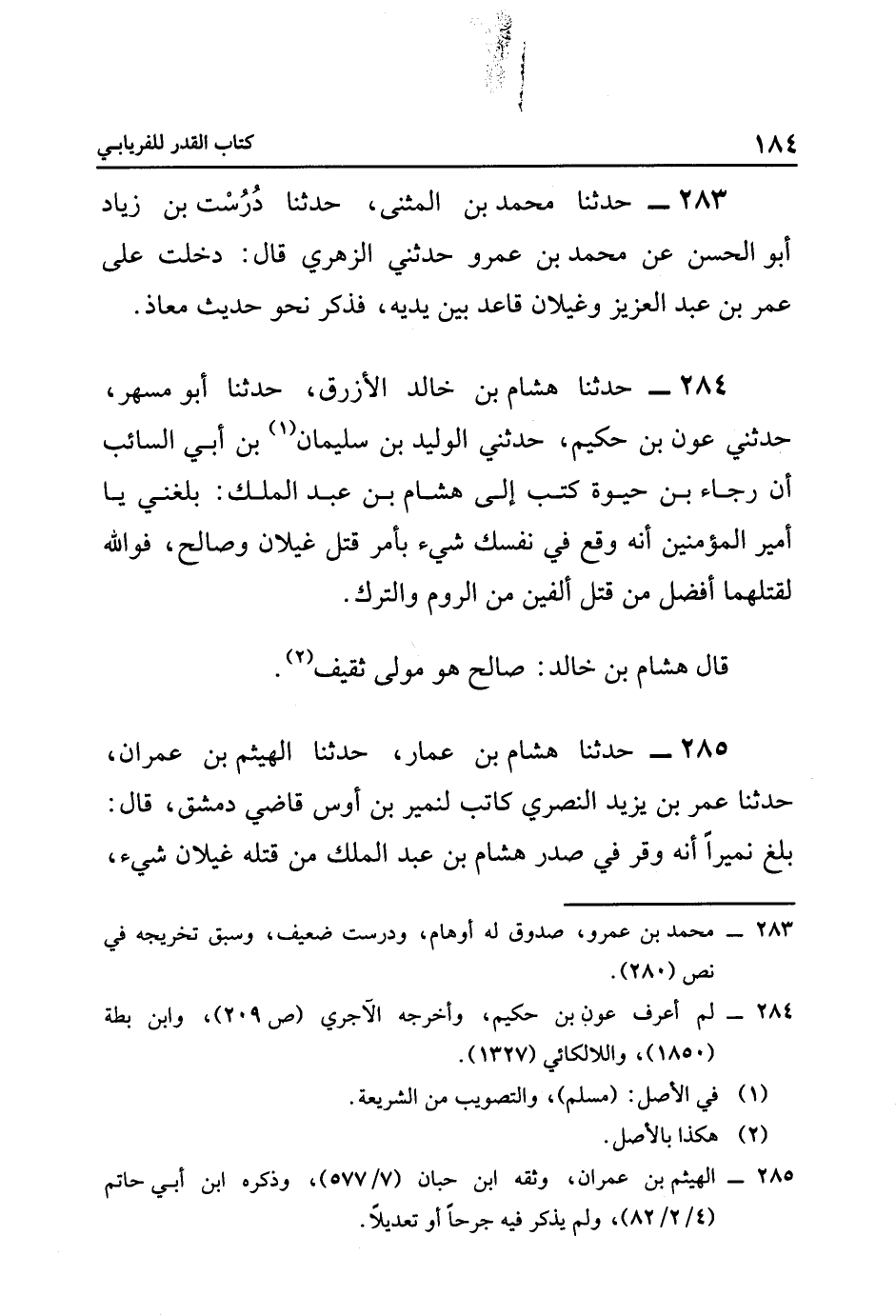 ٢٨٥ حَدَّثَنَا هِشَامُ بْنُ عَمَّارٍ، حَدَّثَنَا الْهَيْثَمُ بْنُ عِمْرَانَ، حَدَّثَنَا عُمَرُ بْنُ يَزِيدَ النَّصْرِيُّ كَاتِبٌ لِنُمَيْرِ بْنِ أَوْسٍ قَاضِي دِمَشْقَ، قَالَ: بَلَغَ نُمَيْرًا أَنَّهُ وَقَرَ فِي صَدْرِ هِشَامِ بْنِ عَبْدِ الملك من قتله غيلان شيء،