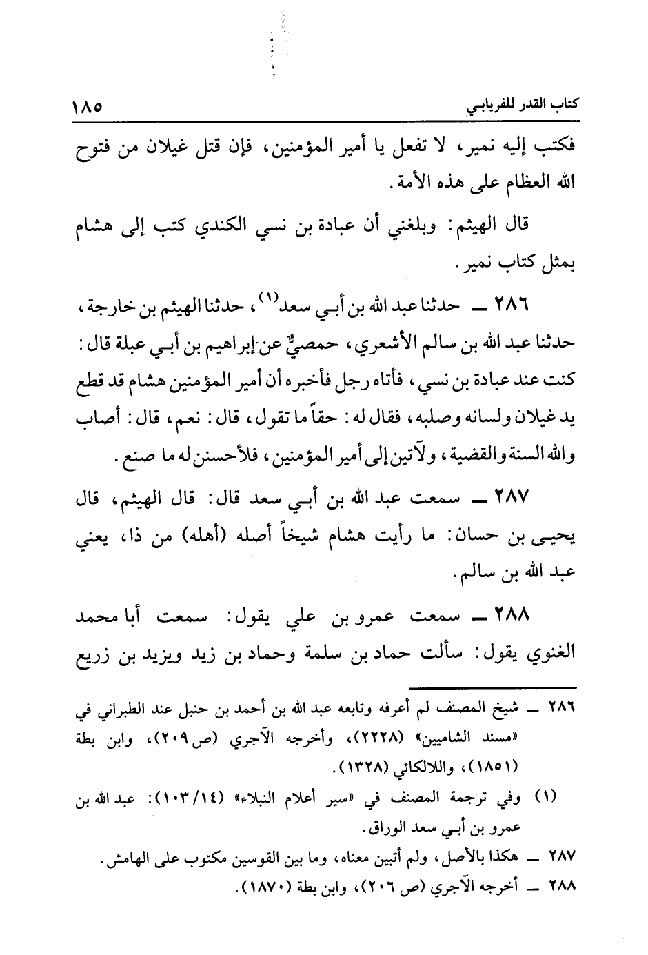 ٢٨٦ حَدَّثَنَا عَبْدُ اللَّهِ بْنُ أَبِي سَعْدٍ١، حَدَّثَنَا الْهَيْثَمُ بْنُ خَارِجَةَ، حَدَّثَنَا عَبْدُ اللَّهِ بْنُ سَالِمٍ الْأَشْعَرِيُّ -حِمْصِيُّ-, عَنْ إِبْرَاهِيمَ بْنِ أَبِي عَبْلَةَ قَالَ: كُنْتُ عِنْدَ عُبَادَةَ بْنِ نُسَيٍّ، فَأَتَاهُ رَجُلٌ, فَأَخْبَرَهُ أن أمير المؤمنين هشام قَدْ قَطَعَ يَدَ غَيْلَانَ, وَلِسَانَهُ, وَصَلَبَهُ، فَقَالَ لَهُ: حَقًّا مَا تَقُولُ؟، قَالَ: نَعَمْ، قَالَ: أَصَابَ, وَاللَّهِ, السُّنَّةَ وَالْقَضِيَّةَ، وَلَآتِينَّ إِلَى أَمِيرِ الْمُؤْمِنِينَ، فلأُحَسِنَنَّ لَهُ مَا صَنَعَ.