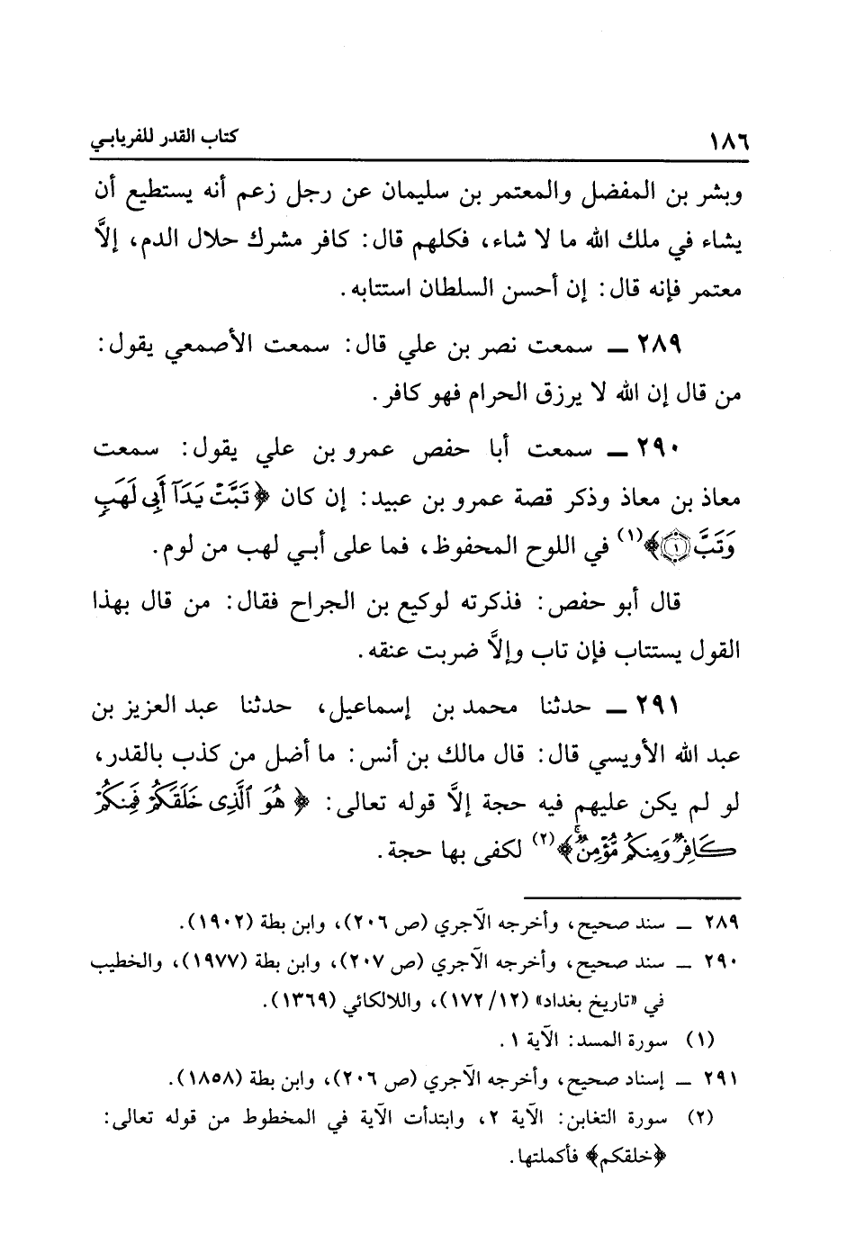 ٢٩٠- سند صحيح، وأخرجه الآجري: صـ ٢٠٧، وابن بطة: ١٩٧٧، والخطيب في: تاريخ بغداد: جـ ١٧٢/١٢، واللالكائي: ١٣٦٩.