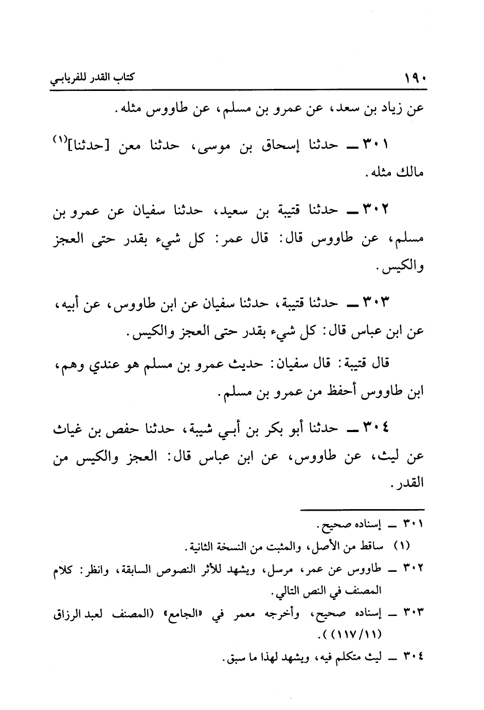 ٣٠٢ حَدَّثَنَا قُتَيْبَةُ بْنُ سَعِيدٍ، حَدَّثَنَا سُفْيَانُ, عَنْ عَمْرِو بْنِ مُسْلِمٍ، عَنْ طاووس, قَالَ: قَالَ عُمَرُ: كُلُّ شَيْءٍ بِقَدَرٍ, حَتَّى الْعَجْزُ وَالْكَيْسُ.