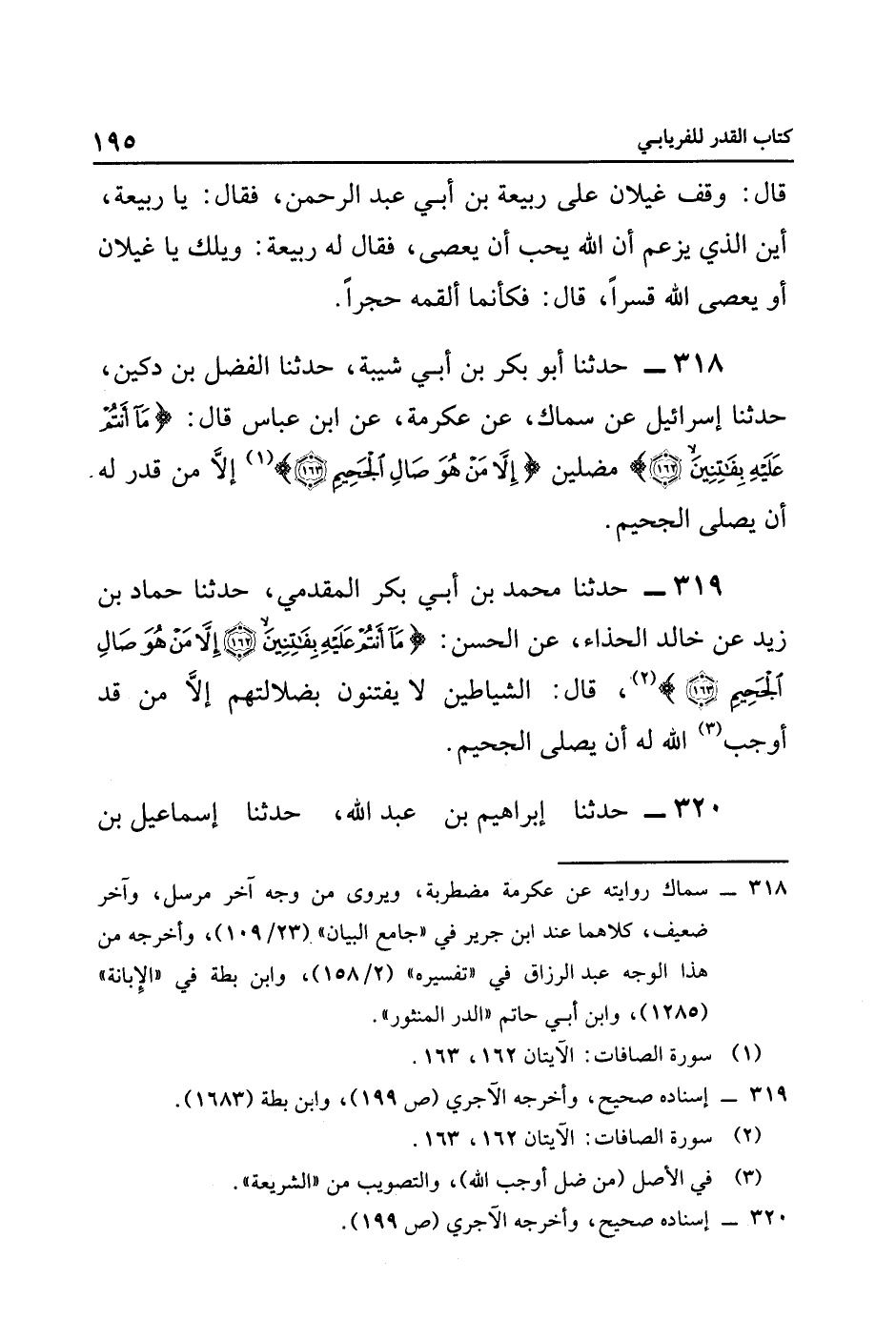 ٣١٩ حَدَّثَنَا مُحَمَّدُ بْنُ أَبِي بَكْرٍ الْمُقَدَّمِيُّ، حَدَّثَنَا حَمَّادُ بْنُ زَيْدٍ, عَنْ خَالِدٍ الْحَذَّاءِ، عَنِ الْحَسَنِ: {مَا أَنْتُمْ عَلَيْهِ بِفَاتِنِينَ إِلَاّ مَنْ هُوَ صَالِي الْجَحِيمِ} ٢، قَالَ: الشَّيَاطِينُ لَا يَفْتِنُونَ بِضَلَالَتِهِمْ, إِلَّا مَنْ قَدْ أَوْجَبَ٣ اللَّهُ لَهُ أَنْ يَصْلَى الْجَحِيمَ.
