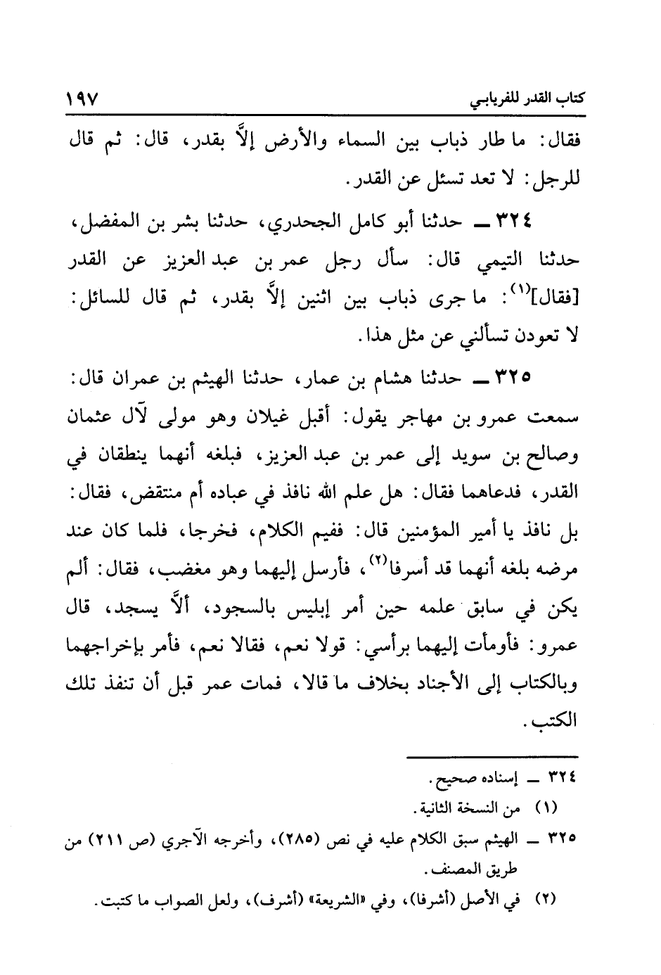 ٣٢٤ حَدَّثَنَا أَبُو كَامِلٍ الْجَحْدَرِيُّ، حَدَّثَنَا بِشْرُ بْنُ الْمُفَضَّلِ، حَدَّثَنَا التَّيْمِيُّ قَالَ: سَأَلَ رَجُلٌ عُمَرَ بْنَ عَبْدِ الْعَزِيزِ عَنِ الْقَدَرِ, [فَقَالَ] ١: مَا جَرَى ذُبَابٌ بَيْنَ اثْنَيْنِ إِلَّا بِقَدَرٍ، ثُمَّ قَالَ لِلسَّائِلِ: لَا تَعُودَنَّ تَسْأَلُنِي عَنْ مِثْلِ هَذَا.