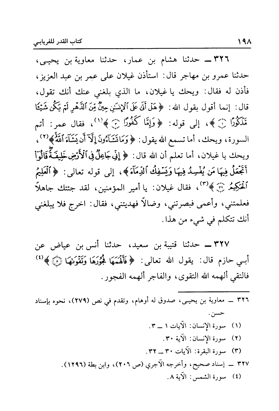 ٣٢٦ حَدَّثَنَا هِشَامُ بْنُ عَمَّارٍ، حَدَّثَنَا مُعَاوِيَةُ بْنُ يَحْيَى، حَدَّثَنَا عَمْرُو بْنُ مُهَاجِرٍ، قَالَ: اسْتَأْذَنَ غَيْلَانُ عَلَى عُمَرَ بْنِ عَبْدِ الْعَزِيزِ، فَأَذِنَ لَهُ, فَقَالَ: وَيْحَكَ يَا غَيْلَانُ، مَا الَّذِي بَلَغَنِي عَنْكَ أَنَّكَ تَقُولُ؟، قَالَ: إِنَّمَا أَقُولُ بِقَوْلِ اللَّهِ: {هَلْ أَتَى عَلَى الإِنسَانِ حِينٌ مِنَ الدَّهْرِ لَمْ يَكُنْ شَيْئاً مَذْكُوراً} , إلى قوله: {وَإِمَّا كَفُوراً} ١، فَقَالَ عُمَرُ: أَتِمَّ السُّورَةَ، وَيْحَكَ، أَمَا تَسْمَعُ اللَّهَ يَقُولُ: {وَمَا تَشَاءُونَ إِلَاّ أَنْ يَشَاءَ اللَّهُ} ٢، وَيْحَكَ يَا غَيْلَانُ، أَمَا تَعْلَمُ أَنَّ اللَّهَ قَالَ: {إِنِّي جَاعِلٌ فِي الأَرْضِ خَلِيفَةً قَالُوا أَتَجْعَلُ فِيهَا مَنْ يُفْسِدُ فِيهَا وَيَسْفِكُ الدِّمَاءَ} , إلى قوله تعالى: {الْعَلِيمُ الْحَكِيمُ} ٣، فَقَالَ غَيْلَانُ: يَا أَمِيرَ الْمُؤْمِنِينَ، لَقَدْ جِئْتُكَ جَاهِلًا فَعَلَّمْتَنِي، وَأَعْمَى فَبَصَّرْتَنِي، وَضَالًّا فَهَدَيْتَنِي، فَقَالَ: اخْرُجْ, فَلَا يَبْلُغْنِي أَنَّكَ تَتَكَلَّمُ فِي شَيْءٍ مِنْ هَذَا.