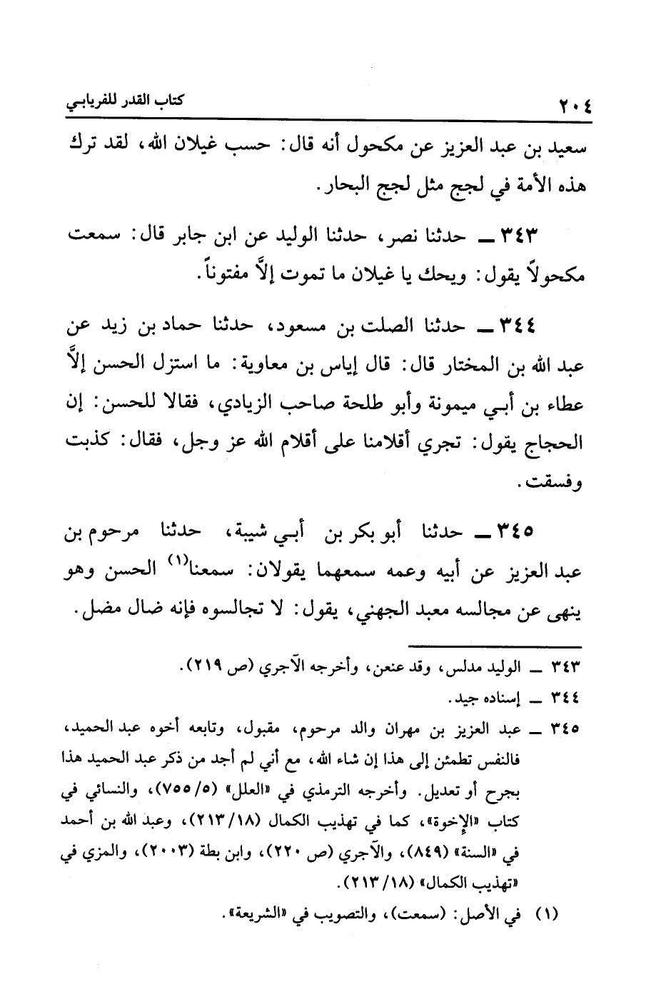 ٣٤٥ حَدَّثَنَا أَبُو بَكْرِ بْنُ أَبِي شَيْبَةَ، حَدَّثَنَا مَرْحُومُ بْنُ عَبْدِ الْعَزِيزِ، عَنْ أَبِيهِ وَعَمِّهِ سَمِعَهُمَا يَقُولَانِ: سَمِعْنَا١ الْحَسَنَ، وَهُوَ يَنْهَى عَنْ مُجَالَسَةِ مَعْبَدٍ الْجُهَنِيِّ، يَقُولُ: لَا تُجَالِسُوهُ؛ فَإِنَّهُ ضَالٌّ مضل.