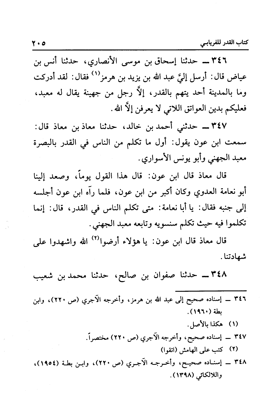 ٣٤٦ حدثنا إسحاق بن موسى الأنصاري، حدثنا أنس بْنُ عِيَاضٍ قَالَ: أَرْسَلَ إليَّ عَبْدُ اللَّهِ بْنُ يَزِيدَ بْنَ هُرْمُزٍ١، فَقَالَ: لَقَدْ أَدْرَكْتُ وَمَا بِالْمَدِينَةِ أَحَدٌ يُتَّهَمُ بِالْقَدَرِ، إِلَّا رَجُلٌ مِنْ جُهَيْنَةَ يُقَالُ لَهُ مَعْبَدٌ، فَعَلَيْكُمْ بِدِينِ الْعَوَاتِقِ اللَّاتِي لَا يَعْرِفْنَ إِلَّا اللَّهَ.