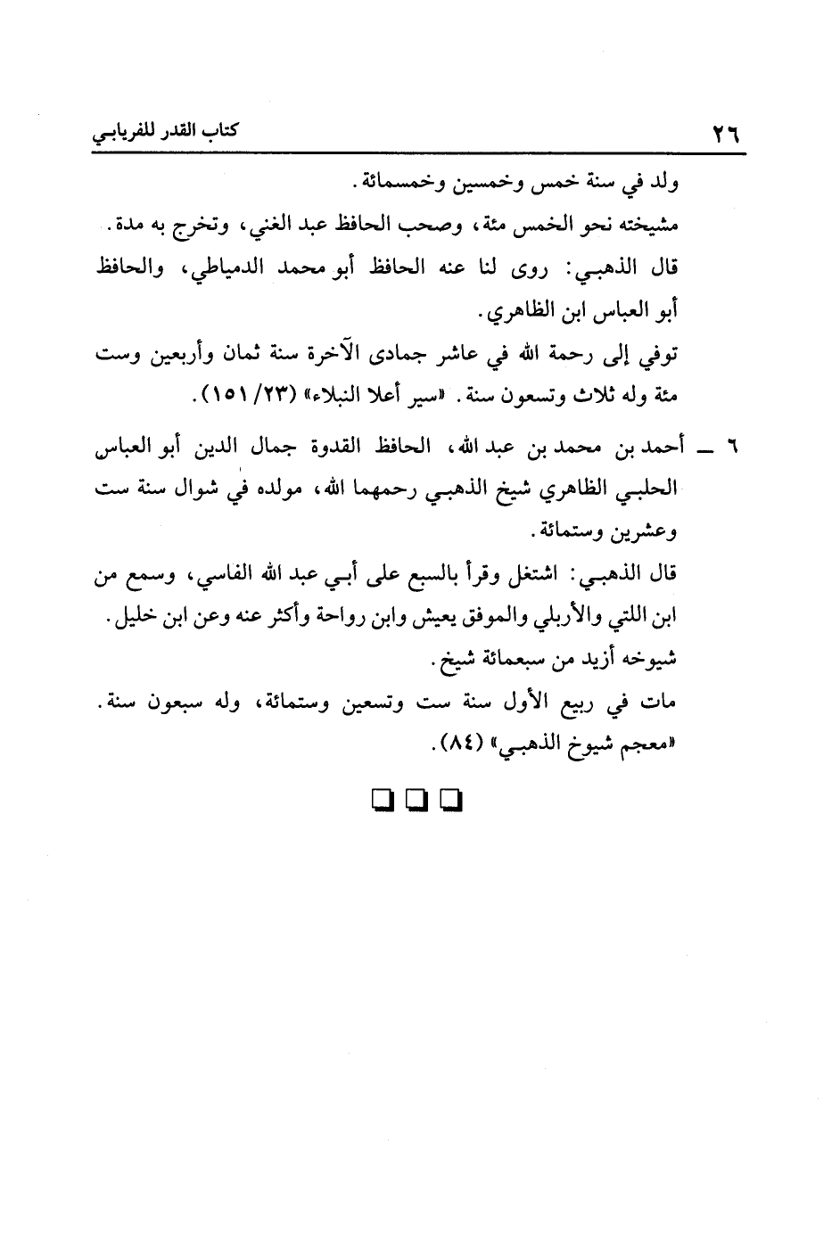 ٦ أحمد بن محمد بن عبد الله، الحافظ, القدوة, جمال الدين أبو العباس, الحلبي, الظاهري, شيخ الذهبي رحمهما الله، مولده في شوال سنة ست وعشرين وستمائة.