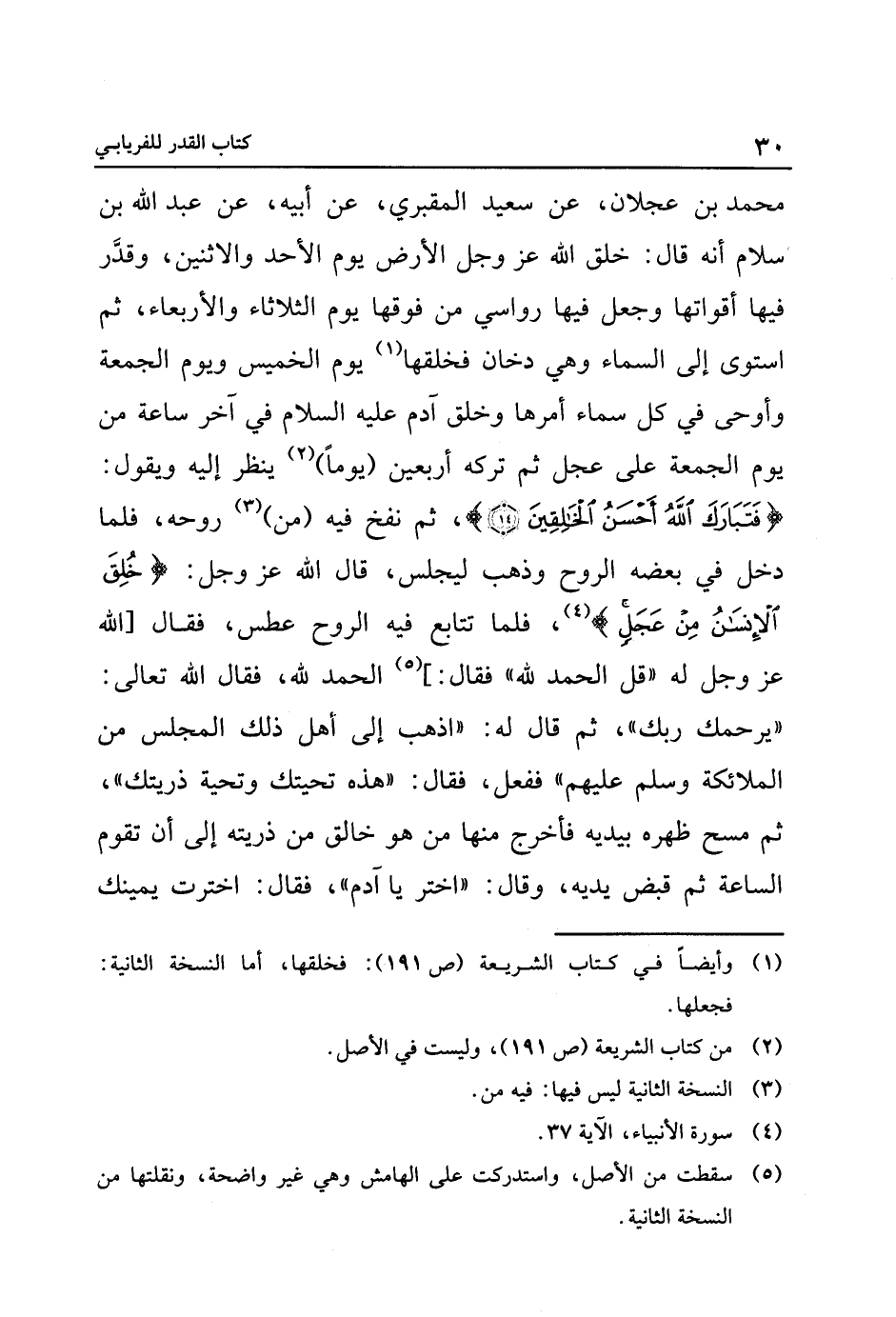 مُحَمَّدِ بْنِ عَجْلَانَ، عَنْ سَعِيدٍ الْمَقْبُرِيِّ، عَنْ أَبِيهِ، عَنْ عَبْدِ اللَّهِ بْنِ سَلَامٍ أَنَّهُ قَالَ: خَلَقَ اللَّهُ عَزَّ وَجَلَّ الْأَرْضَ يَوْمَ الْأَحَدِ وَالِاثْنَيْنِ، وقدَّر فِيهَا أَقْوَاتَهَا, وَجَعَلَ فِيهَا رَوَاسِيَ مَنْ فَوْقِهَا يَوْمَ الثُّلَاثَاءِ وَالْأَرْبِعَاءِ، ثُمَّ اسْتَوَى إِلَى السَّمَاءِ, وَهِيَ دُخَانٌ, فَخَلَقَهَا ١ يَوْمَ الْخَمِيسِ وَيَوْمَ الْجُمُعَةِ, وَأَوْحَى فِي كُلِّ سَمَاءٍ أَمْرَهَا, وَخَلَقَ آدَمَ عَلَيْهِ السَّلَامُ فِي آخِرِ سَاعَةٍ مِنْ يَوْمِ الْجُمُعَةِ عَلَى عَجَلٍ, ثُمَّ تَرَكَهُ أَرْبَعِينَ يَوْمًا ٢ يَنْظُرُ إِلَيْهِ, وَيَقُولُ: {فَتَبَارَكَ اللَّهُ أَحْسَنُ الْخَالِقِينَ}، ثُمَّ نَفَخَ فِيهِ مَنْ ٣ رُوحِهِ، فَلَمَّا دَخَلَ فِي بَعْضِهِ الرُّوحُ, وَذَهَبَ لِيَجْلِسَ، قَالَ اللَّهُ عز وجل: {خُلِقَ الإِنسَانُ مِنْ عَجَلٍ} ٤، فَلَمَّا تَتَابَعَ فِيهِ الرُّوحُ عَطَسَ، فَقَالَ اللَّهُ عَزَّ وَجَلَّ لَهُ: {قُلِ الْحَمْدُ لِلَّه} فَقَالَ:٥ الْحَمْدُ لِلَّهِ، فَقَالَ اللَّهُ تَعَالَى: يَرْحَمُكَ رَبُّكَ، ثُمَّ قَالَ لَهُ: اذْهَبْ إِلَى أَهْلِ ذَلِكَ الْمَجْلِسِ مِنَ الْمَلَائِكَةِ, وَسَلِّمْ عَلَيْهِمْ, فَفَعَلَ، فَقَالَ: هَذِهِ تَحِيَّتُكَ وَتَحِيَّةُ ذُرِّيَّتِكَ، ثُمَّ مَسَحَ ظَهْرَهُ بِيَدَيْهِ, فَأَخْرَجَ مِنْهَا مَنْ هُوَ خَالِقٌ مِنْ ذُرِّيَّتِهِ إِلَى أَنْ تَقُومَ السَّاعَةُ, ثُمَّ قَبَضَ يَدَيْهِ، وَقَالَ: اخْتَرْ يَا آدَمُ، فَقَالَ: اخْتَرْتُ يمينك