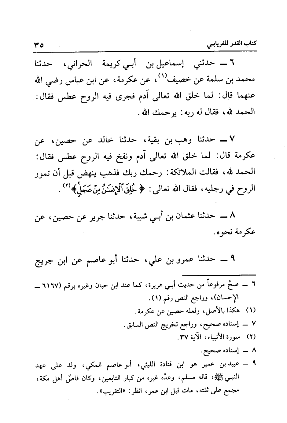 ٧ حَدَّثَنَا وَهْبُ بْنُ بَقِيَّةَ، حَدَّثَنَا خَالِدٌ، عَنْ حُصَيْنٍ، عَنْ عِكْرِمَةَ، قَالَ: لما خلق الله تعالى آدم ونفح فِيهِ الرُّوحَ عَطَسَ، فَقَالَ: الْحَمْدُ لِلَّهِ، فَقَالَتِ الْمَلَائِكَةُ: رَحِمَكَ رَبُّكَ، فَذَهَبَ يَنْهَضُ قَبْلَ أَنْ تَمُورَ الرُّوحُ فِي رِجْلَيْهِ، فَقَالَ اللَّهُ تَعَالَى: {خُلِقَ الإِنسَانُ مِنْ عَجَلٍ} ٢.