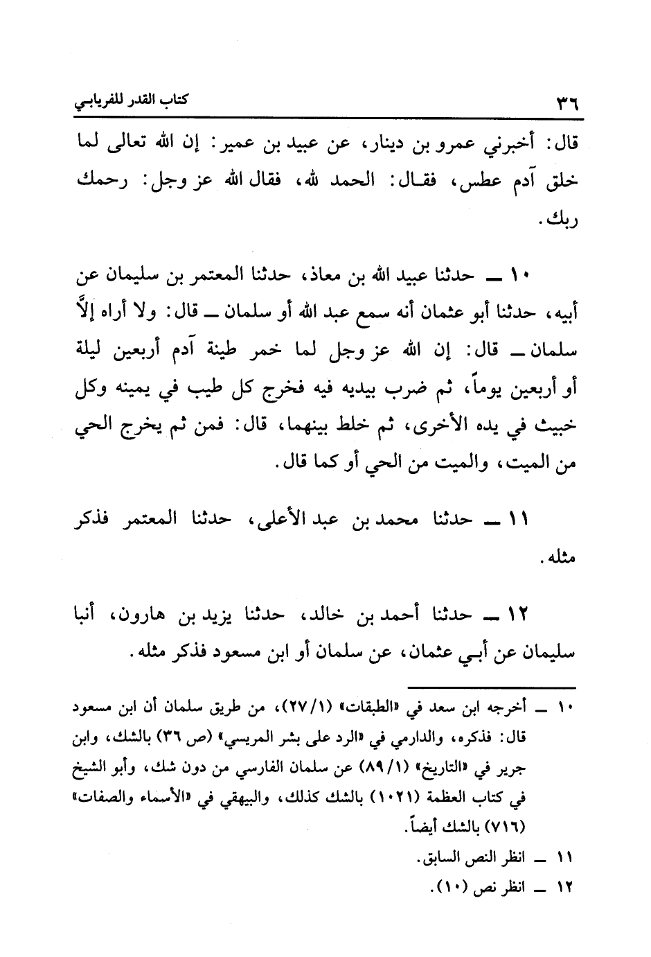 ١٠ حَدَّثَنَا عُبَيْدُ اللَّهِ بْنُ مُعَاذٍ، حَدَّثَنَا الْمُعْتَمِرُ بْنُ سُلَيْمَانَ، عَنْ أَبِيهِ، حَدَّثَنَا أَبُو عُثْمَانَ أَنَّهُ سَمِعَ، عَبْدَ اللَّهِ، أَوْ سَلْمَانَ -قَالَ: وَلَا أُرَاهُ إِلَّا سَلْمَانَ- قَالَ: إِنَّ اللَّهَ عَزَّ وَجَلَّ لَمَّا خَمَّرَ طِينَةَ آدَمَ أَرْبَعِينَ لَيْلَةً أَوْ أَرْبَعِينَ يَوْمًا، ثُمَّ ضَرَبَ بِيَدَيْهِ فِيهِ، فَخَرَجَ كُلُّ طَيِّبٍ فِي يَمِينِهِ، وَكُلُّ خَبِيثٍ فِي يَدِهِ الْأُخْرَى، ثُمَّ خَلَطَ بَيْنَهُمَا، قَالَ: فَمِنْ ثَمَّ يُخْرِجُ الْحَيَّ مِنَ الْمَيِّتِ، وَالْمَيَّتَ مِنَ الْحَيِّ، أَوْ كَمَا قَالَ.